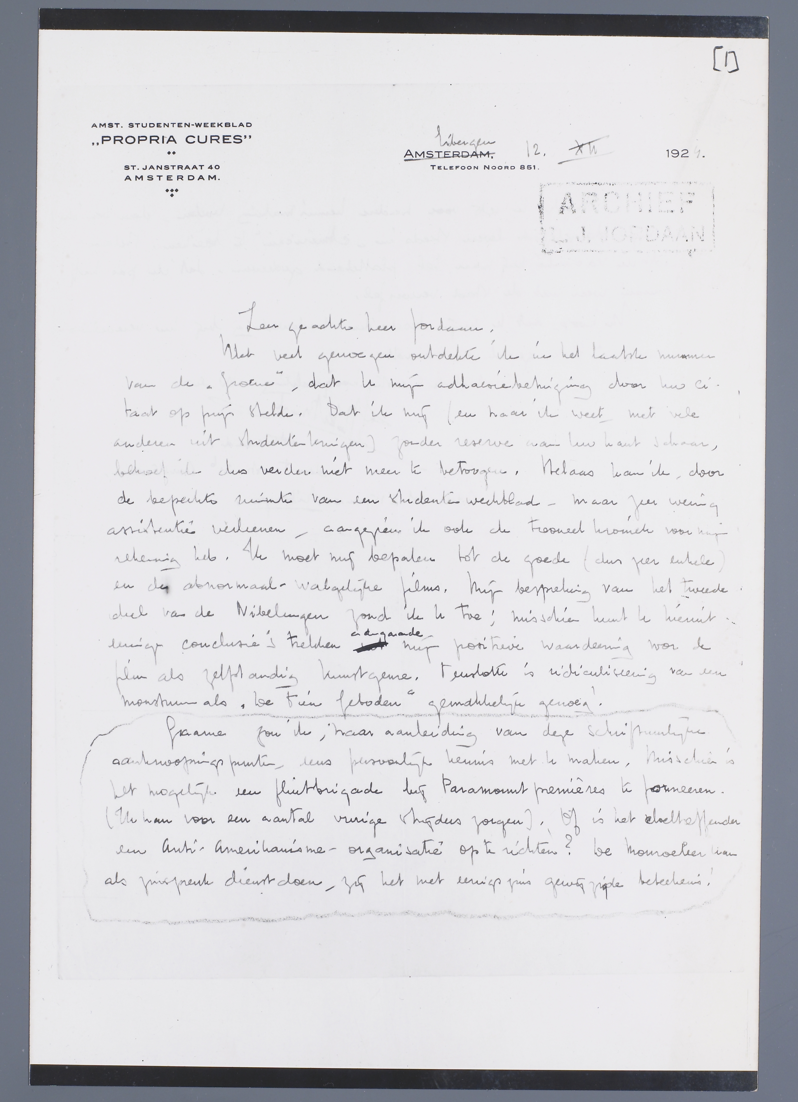 Met veel genoegen ontdekte ik in het laatste nummer van de ‘Groene’, dat U mijn adhaesiebetuiging door Uw citaat op prijs stelde. Dat ik mij (en naar ik weet, met vele anderen uit studentenkringen) zonder reserve aan Uw kant schaar, behoef ik dus verder niet meer te betoogen. Helaas kan ik, door de beperkte ruimte van een studentenweekblad, maar zeer weinig assistentie verleenen, aangezien ik ook de Tooneel kroniek voor mijn rekening heb. Ik moet mij bepalen tot de goede (dus zeer enkele) en den abnormaal-walgelijke films. Mijn bespreking van het tweede deel van de Nibelungen zond ik U toe; misschien kunt U hieruit eenige conclusie's trekken aangaande mijn positieve waardeering voor de film als zelfstandig kunstgenre. Tenslotte is ridiculiseering van een monstrum als ‘De Tien Geboden’ gemakkelijk genoeg!