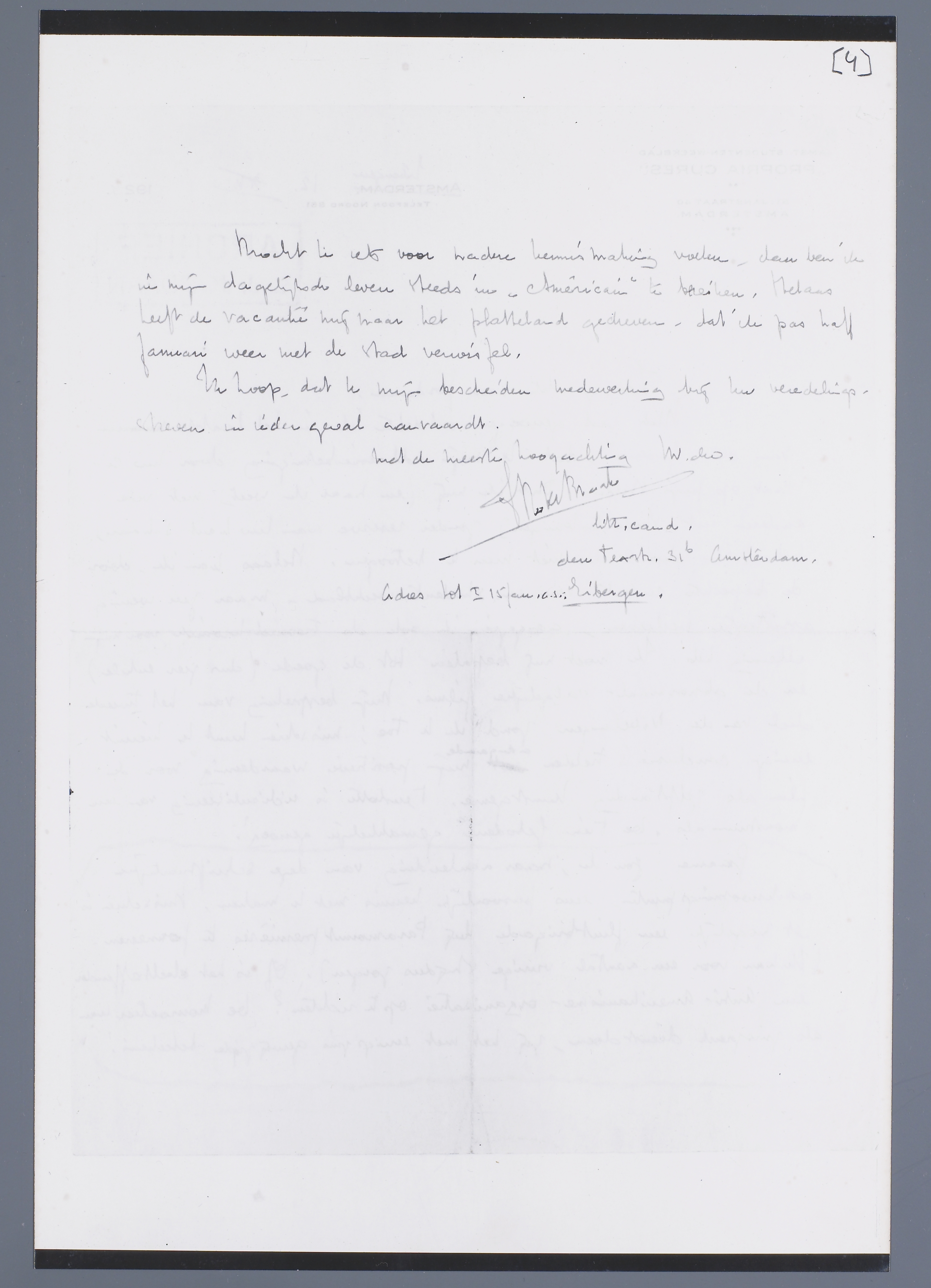 Mocht U iets voor nadere kennismaking voelen, dan ben ik in mijn dagelijksch leven steeds in ‘Américain’ te bereiken. Helaas heeft de vacantie mij naar het platteland gedreven, dat ik pas half Januari weer met de stad verwissel.