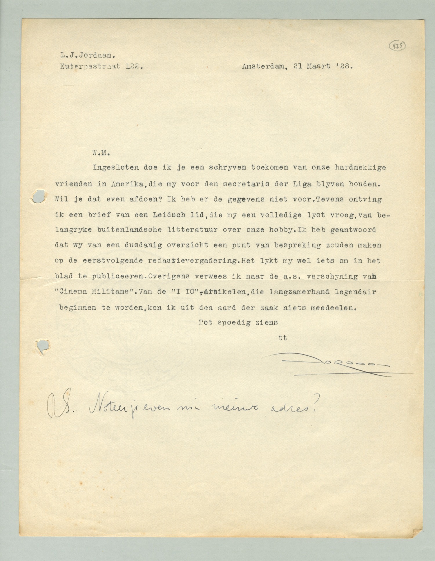 Ingesloten doe ik je een schrijven toekomen van onze hardnekkige vrienden in Amerika, die mij voor den secretaris der Liga blijven houden. Wil je dat even afdoen? Ik heb er de gegevens niet voor. Tevens ontving ik een brief van een Leidsch lid, die mij een volledige lijst vroeg, van belangrijke buitenlandsche litteratuur over onze hobby. Ik heb geantwoord dat wij van een dusdanig overzicht een punt van bespreking zouden maken op de eerstvolgende redactievergadering. Het lijkt mij wel iets om in het blad te publiceeren. Overigens verwees ik naar de a.s. verschijning van Cinema Militans. Van de i10-artikelen, die langzamerhand legendair beginnen te worden, kon ik uit den aard der zaak niets meedeelen.