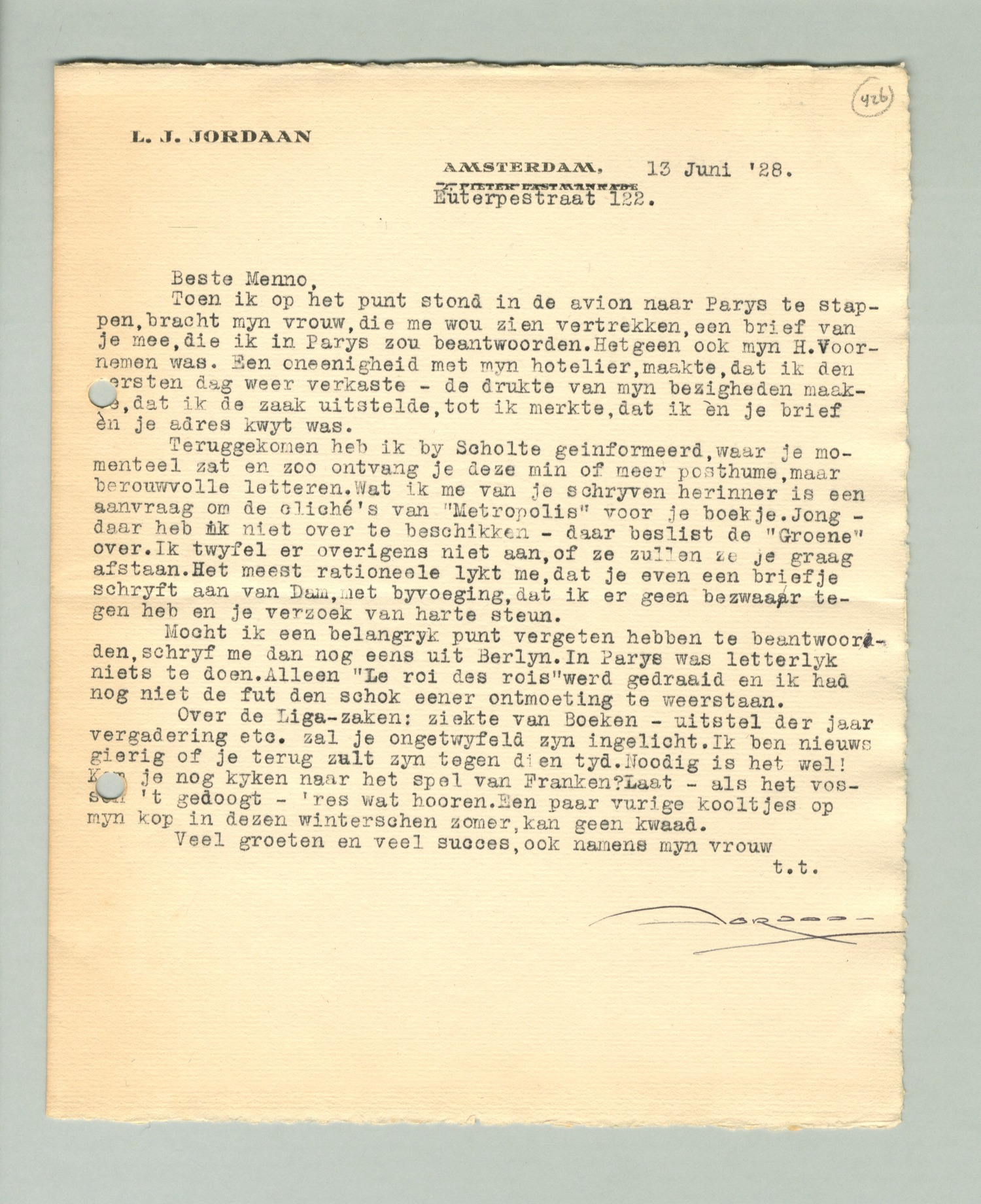 Teruggekomen heb ik bij Scholte geinformeerd, waar je momenteel zat en zoo ontvang je deze min of meer posthume, maar berouwvolle letteren. Wat ik me van je schrijven herinner is een aanvraag om de cliché's van Metropolis voor je boekje. Jong - daar heb ik niet over te beschikken - daar beslist de Groene over. Ik twijfel er overigens niet aan, of ze zullen ze je graag afstaan. Het meest rationeele lijkt me, dat je even een briefje schrijft aan van Dam, met bijvoeging, dat ik er geen bezwaar tegen heb en je verzoek van harte steun.