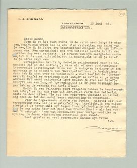Toen ik op het punt stond in de avion naar Parijs te stappen, bracht mijn vrouw, die me wou zien vertrekken, een brief van je mee, die ik in Parijs zou beantwoorden. Hetgeen ook mijn H. Voornemen was. Een oneenigheid met mijn hotelier, maakte dat ik den eersten dag weer verkaste - de drukte van mijn bezigheden maakte, dat ik de zaak uitstelde, tot ik merkte, dat ik èn je brief èn je adres kwijt was.