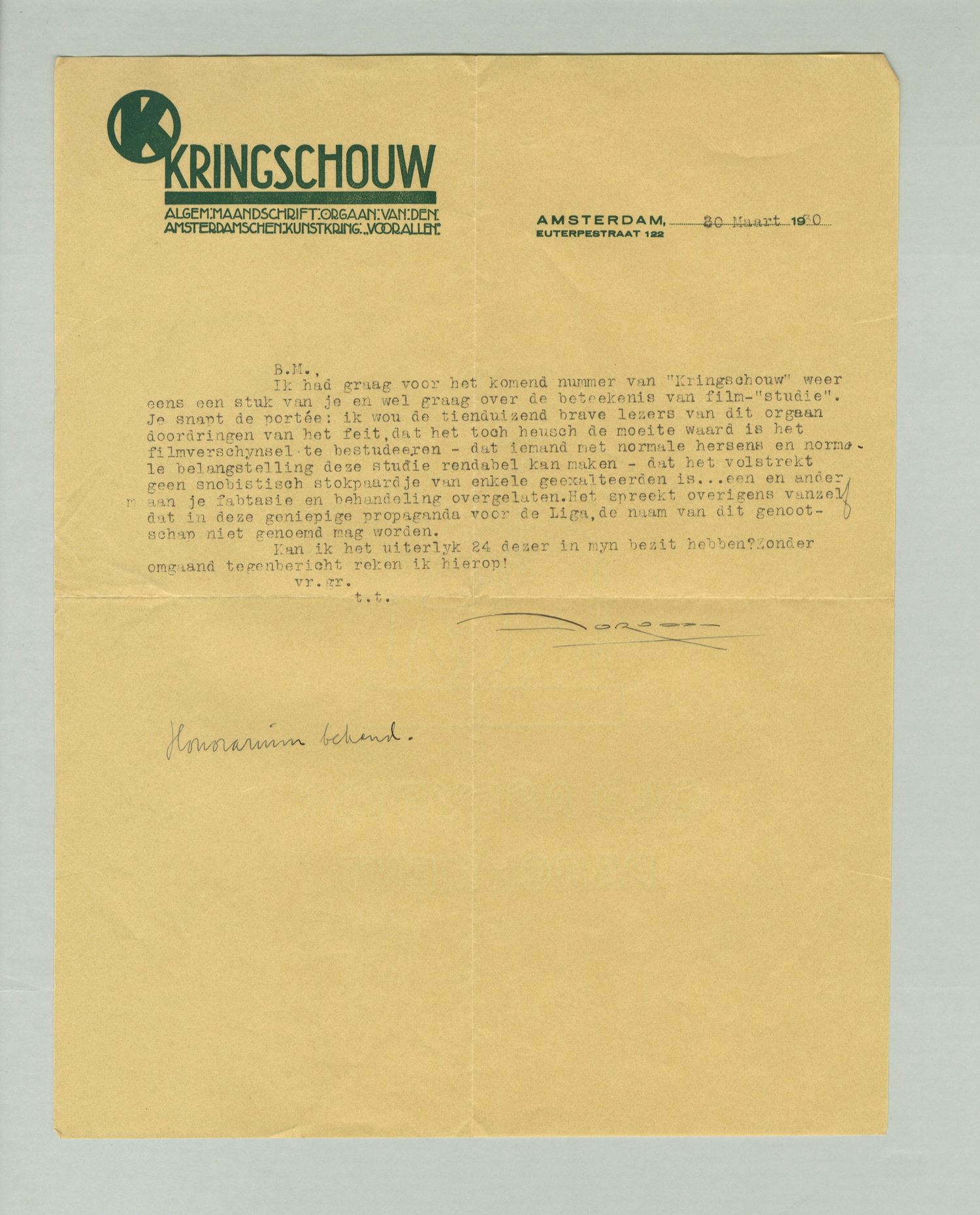 Ik had graag voor het komend nummer van Kringschouw weer eens een stuk van je en wel graag over de beteekenis van film-‘studie’. Je snapt de portée: ik wou de tienduizend brave lezers van dit orgaan doordringen van het feit, dat het toch heusch de moeite waard is het filmverschijnsel te bestudeeren - dat iemand met normale hersens en normale belangstelling deze studie rendabel kan maken - dat het volstrekt geen snobistisch stokpaardje van enkele geexalteerden is... een en ander aan je fantasie en behandeling overgelaten. Het spreekt overigens vanzelf dat in deze geniepige propaganda voor de Liga, de naam van dit genootschap niet genoemd mag worden.