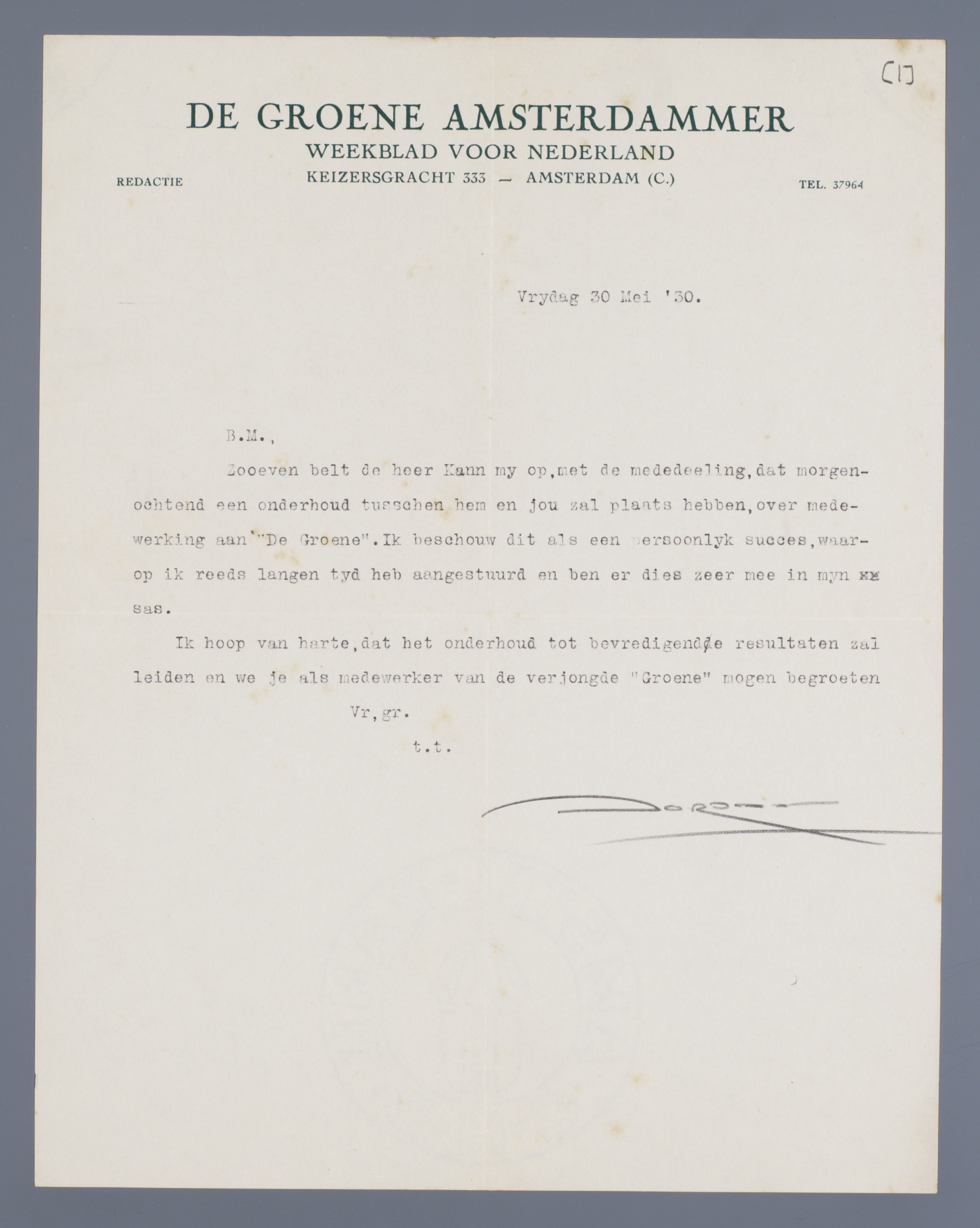 Zooeven belt de heer Kann mij op, met de mededeeling, dat morgenochtend een onderhoud tusschen hem en jou zal plaats hebben, over medewerking aan ‘De Groene’. Ik beschouw dit als een persoonlijk succes, waarop ik reeds langen tijd heb aangestuurd en ben er dies zeer mee in mijn sas.