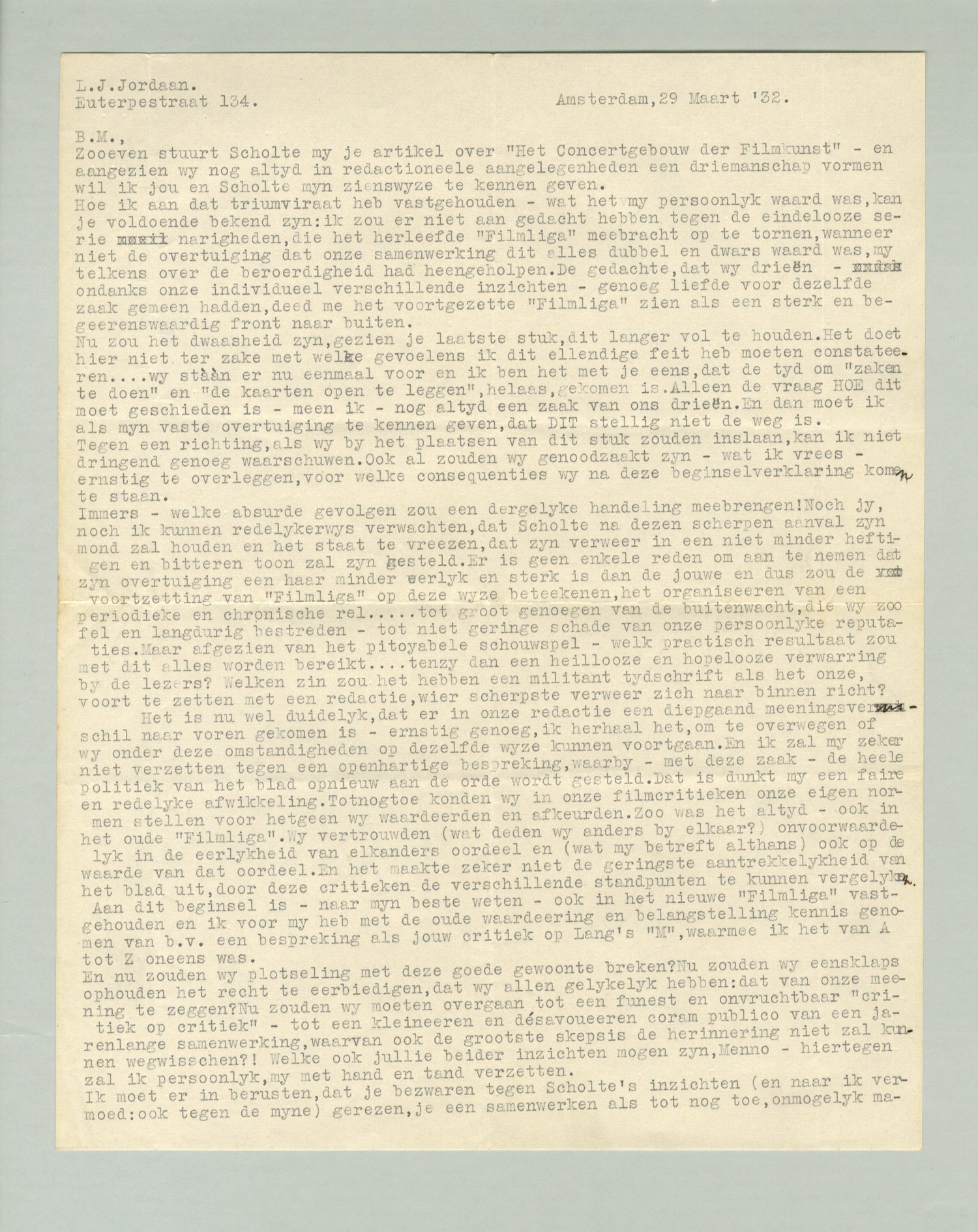 Immers - welke absurde gevolgen zou een dergelijke handeling meebrengen! Noch jij, noch ik kunnen redelijkerwijs verwachten, dat Scholte na deze scherpen aanval zijn mond zal houden en het staat te vreezen, dat zijn verweer in een niet minder heftigen en bitteren toon zal zijn gesteld. Er is geen enkele reden om aan te nemen dat zijn overtuiging een haar minder eerlijk en sterk is dan de jouwe en dus zou de voortzetting van Filmliga op deze wijze beteekenen, het organiseeren van een periodieke en chronische rel... tot groot genoegen van de buitenwacht, die wij zoo fel en langdurig bestreden - tot niet geringe schade van onze persoonlijke reputaties. Maar afgezien van het pitoyabele schouwspel - welk practisch resultaat zou met dit alles worden bereik... tenzij dan een heillooze en hopelooze verwarring bij de lezers? Welken zin zou het hebben een militant tijdschrift als het onze, voort te zetten met een redactie, wier scherpste verweer zich naar binnen richt?