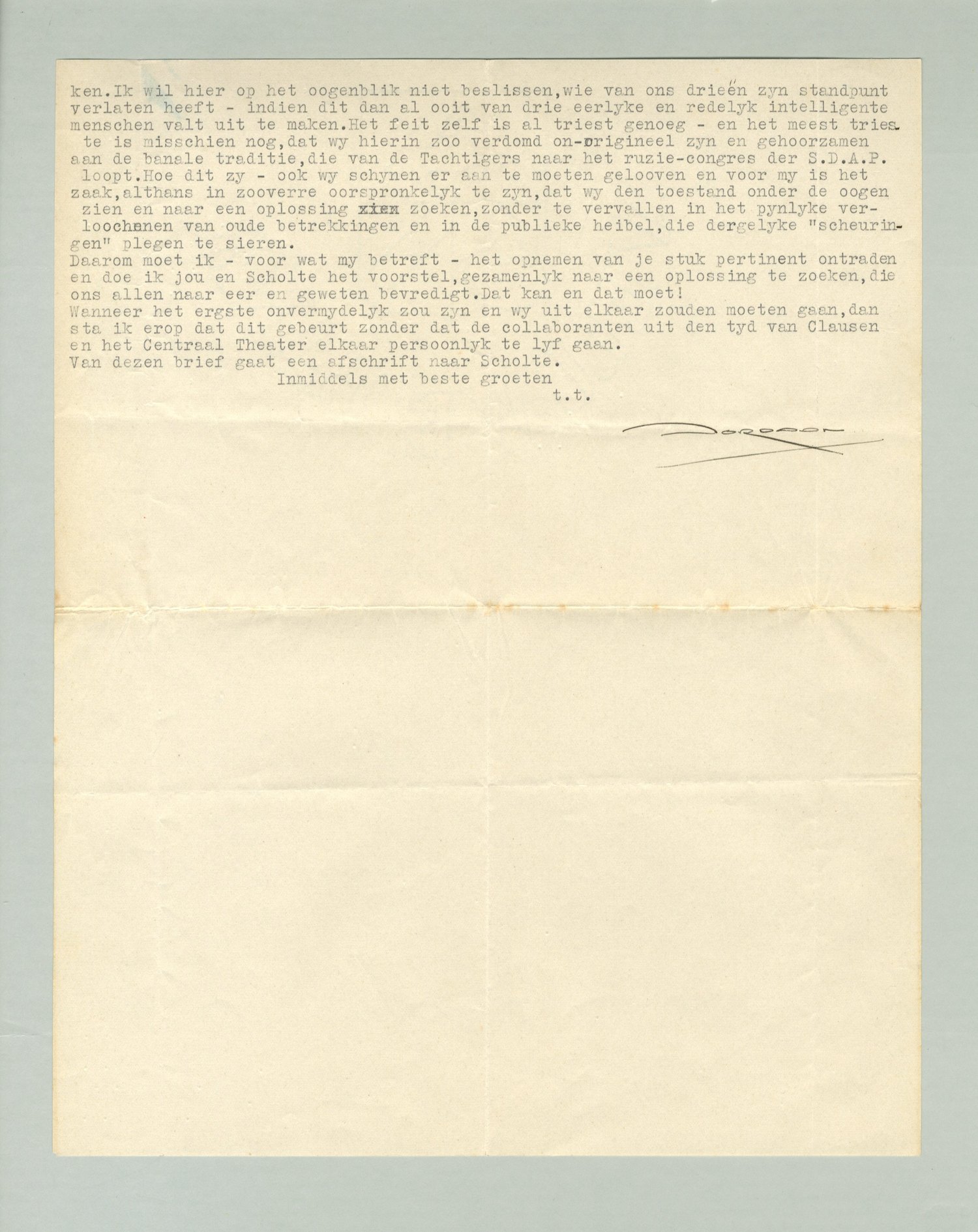 Ik moet er in berusten, dat je bezwaren tegen Scholte's inzichten (en naar ik vermoed ook de mijne) gerezen, je een samenwerken als tot nog toe, onmogelijk maken. Ik wil hier op het oogenblik niet beslissen, wie van ons drieën zijn standpunt verlaten heeft - indien dit dan al ooit van drie eerlijke en redelijk intelligente menschen valt uit te maken. Het feit zelf is al triest genoeg- en het meest trieste is misschien nog, dat wij hierin zoo verdomd on-origineel zijn en gehoorzamen aan de banale traditie, die van de Tachtigers naar het ruzie-congres der S.D.A.P. loopt. Hoe dit zij - ook wij schijnen er aan te moeten gelooven en voor mij is het zaak, althans in zooverre oorspronkelijk te zijn, dat wij den toestand onder de oogen zien en naar een oplossing zoeken, zonder te vervallen in het pijnlijke verloochenen van oude betrekkingen en in de publieke heibel, die dergelijke ‘scheuringen’ plegen te sieren.