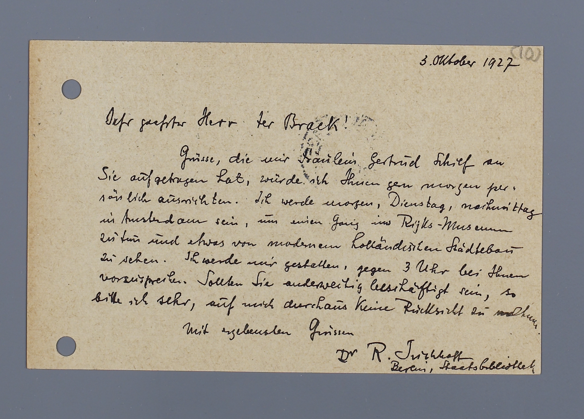 Grüsse die mir Fraulein Gertrud Schilf an Sie aufgetragen hat, würde ich Ihnen morgen persönlich ausrichten. Ich werde morgen, Dienstag, nachmittag in Amsterdam sein, um einen gang ins Rijks-Museum zu tun und etwas von moderner holländischen Städtebau zu sehen. Ich werde mir gestatten, gegen 3 Uhr bei Ihnen vorzusprechen. Sollten Sie andersweilig beschäftigt sein, so bitte ich sehr, auf mich durchaus keine Rücksicht zu nehmen.