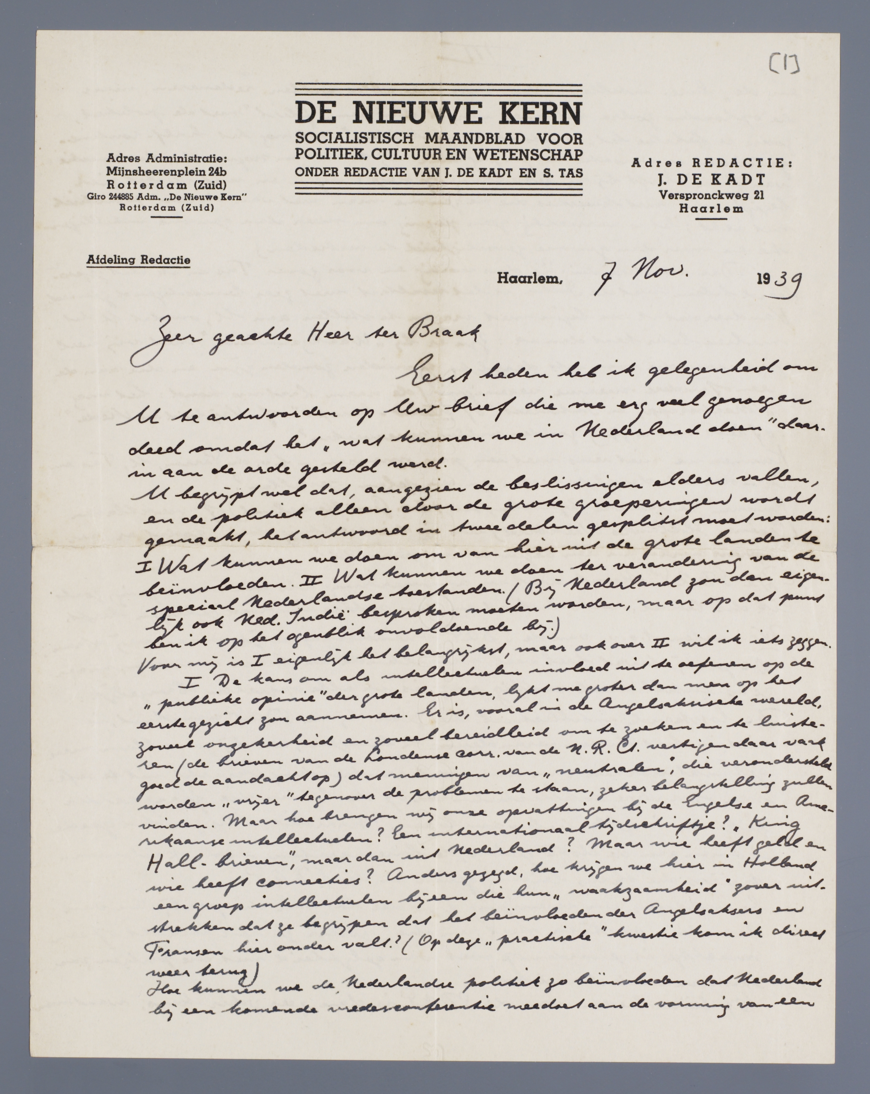 I De kans om als intellectuelen invloed uit te oefenen op de ‘publieke opinie’ der grote landen, lijkt me groter dan men op het eerste gezicht zou aannemen. Er is, vooral in de Angelsaksische wereld, zoveel onzekerheid en zoveel bereidheid om te zoeken en te luisteren (de brieven van de Londense corr. van de N.R.C. vestigen daar vaak goed de aandacht op) dat meningen van ‘neutralen’, die verondersteld worden ‘vrijer’ tegenover de problemen te staan, zeker belangstelling zullen vinden. Maar hoe brengen wij onze opvattingen bij de Engelse en Amerikaanse intellectuelen? Een internationaal tijdschriftje? ‘King Hall-brieven’, maar dan uit Nederland? Maar wie heeft geld en wie heeft connecties? Anders gezegd, hoe krijgen we hier in Holland een groep intellectuelen bijeen die hun ‘waakzaamheid’ zover uitstrekken dat ze begrijpen dat het beïnvloeden der Angelsaksers en Fransen hieronder valt? (Op deze ‘practische’ kwestie kom ik direct weer terug)