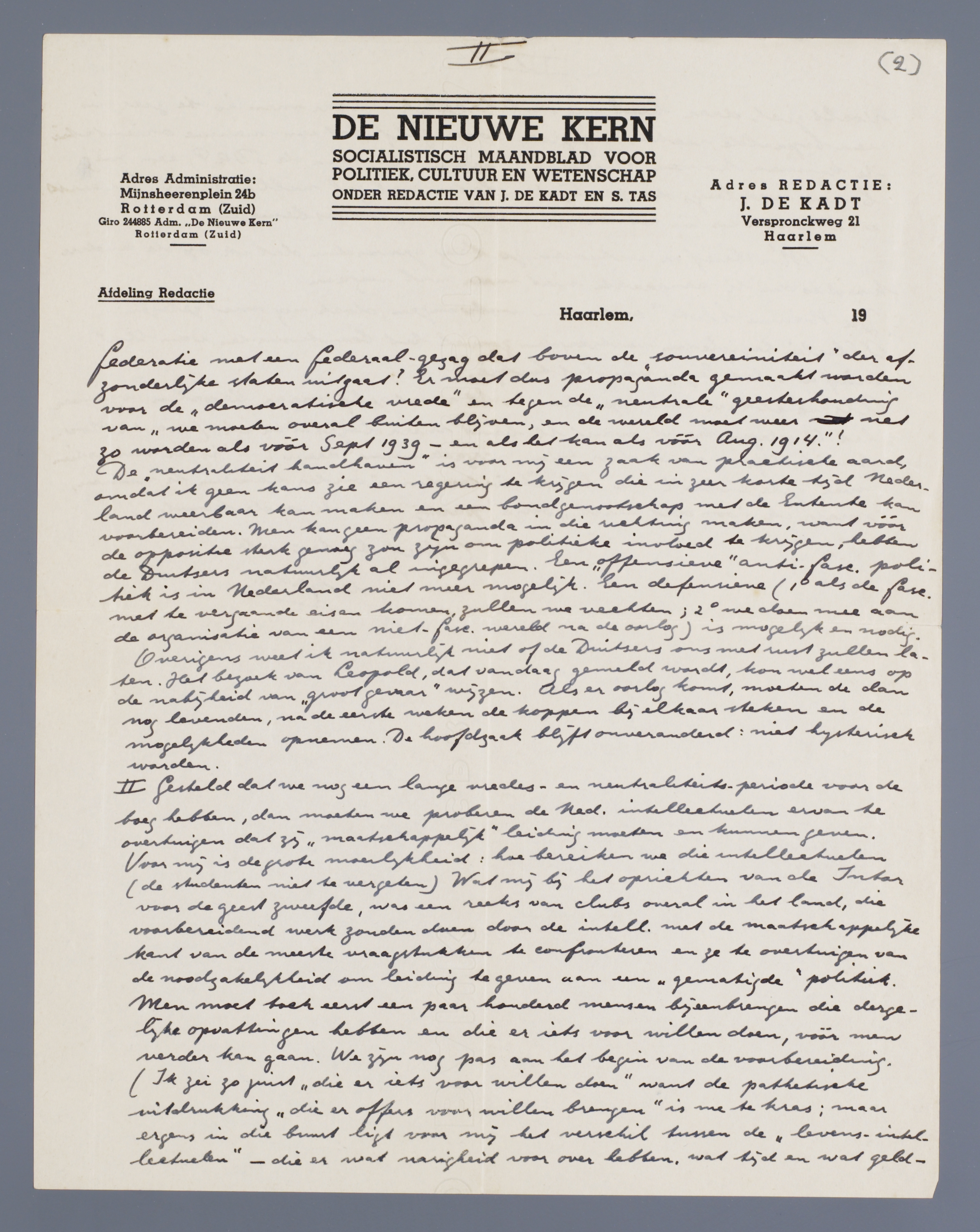 De ‘neutraliteit handhaven’ is voor mij een zaak van practische aard, omdat ik geen kans zie een regering te krijgen die in zeer korte tijd Nederland weerbaar kan maken en een bondgenootschap met de Entente kan voorbereiden. Men kan geen propaganda in die richting maken, want vóór de oppositie sterk genoeg zou zijn om politieke invloed te krijgen, hebben de Duitsers natuurlijk al ingegrepen. Een ‘offensieve’ anti-fasc. politiek is in Nederland niet meer mogelijk. Een defensieve (1o als de fasc. met te vergaande eisen komen, zullen we vechten; 2o we doen mee aan de organisatie van een niet-fasc. wereld na de oorlog) is mogelijk en nodig.