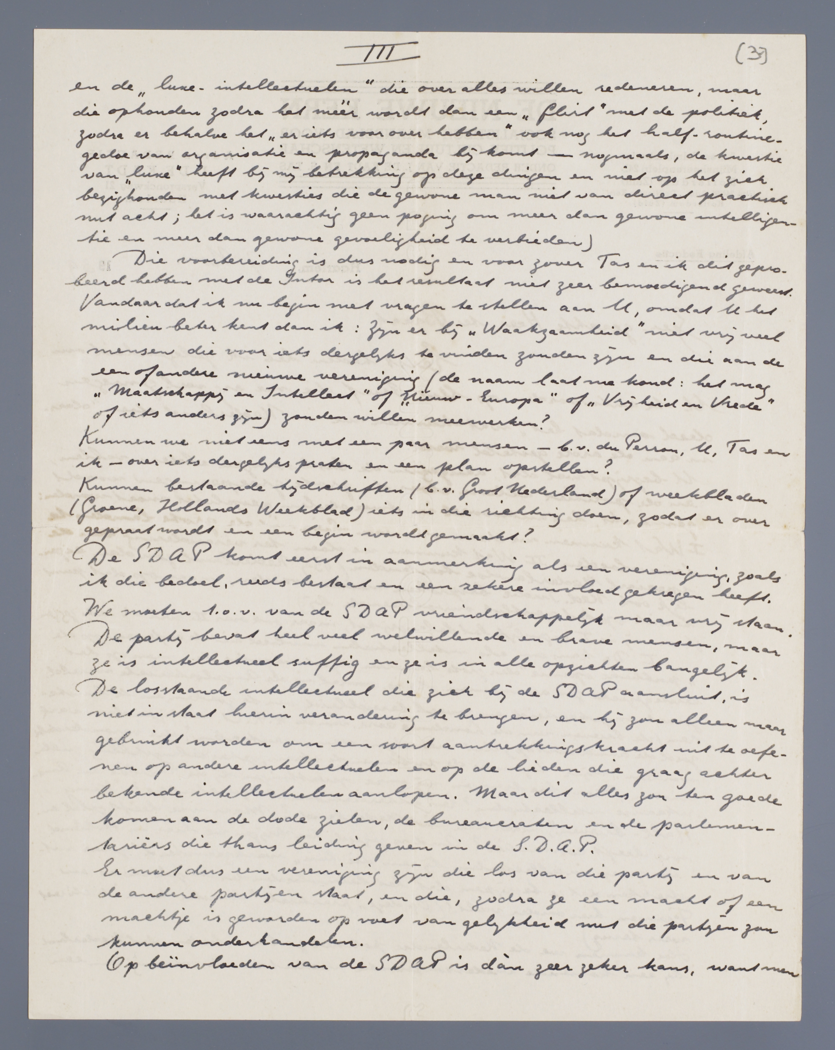 De SDAP komt eerst in aanmerking als een vereniging, zoals ik die bedoel, reeds bestaat en een zekere invloed gekregen heeft. We moeten t.a.v. van de SDAP vriendschappelijk maar vrij staan. De partij bevat heel veel welwillende en brave mensen, maar ze is intellectueel suffig en ze is in alle opzichten bangelijk. De losstaande intellectueel die zich bij de SDAP aansluit, is niet in staat hierin verandering te brengen, en hij zou alleen maar gebruikt worden om een soort aantrekkingskracht uit te oefenen op andere intellectuelen en op de lieden die graag achter bekende intellectuelen aanlopen. Maar dit alles zou ten goede komen aan de dode zielen, de bureaucraten en de parlementariërs die thans leiding geven in de S.D.A.P.