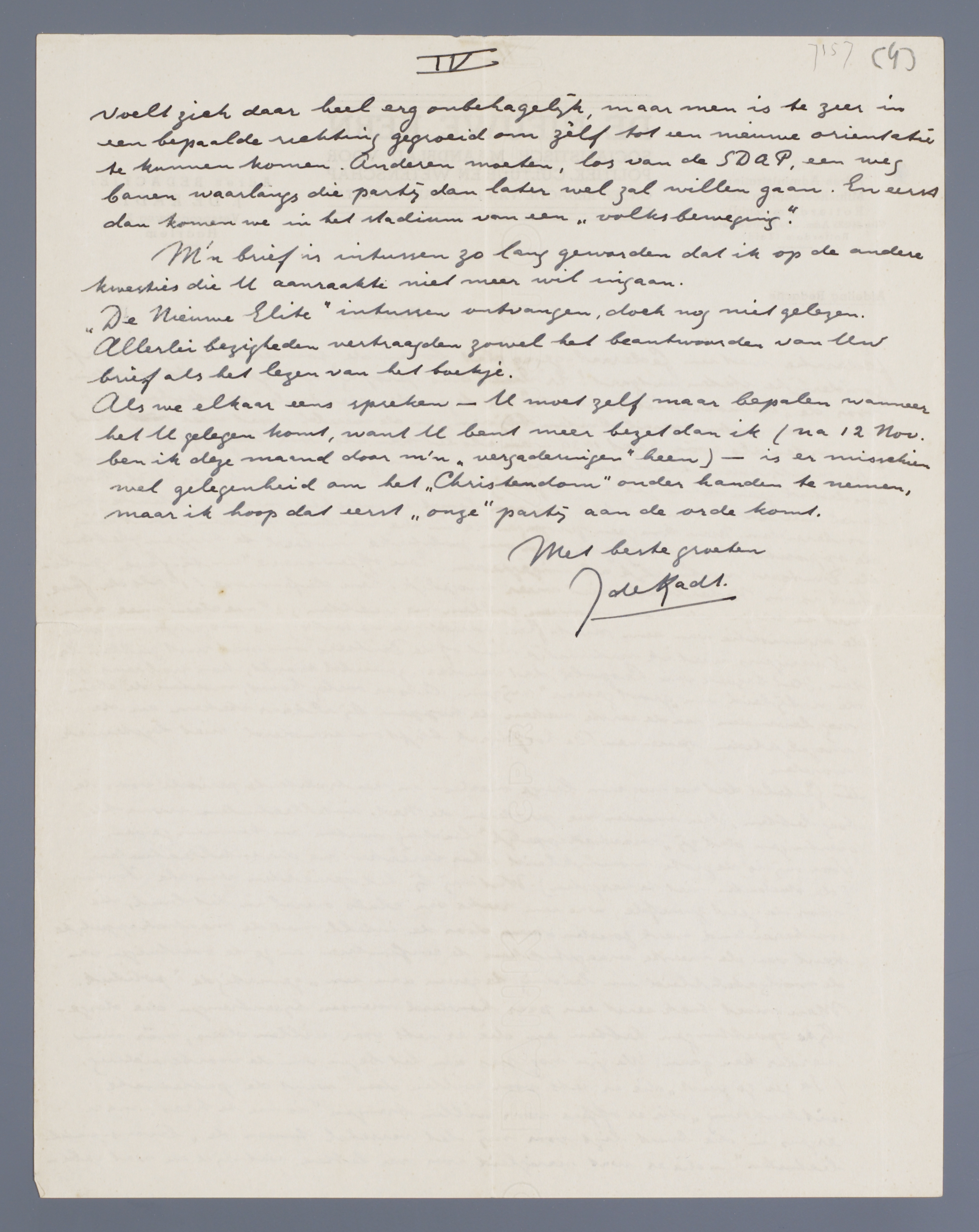 ‘De Nieuwe Elite’ intussen ontvangen, doch nog niet gelezen. Allerlei bezigheden vertraagden zowel het beantwoorden van Uw brief als het lezen van het boekje.