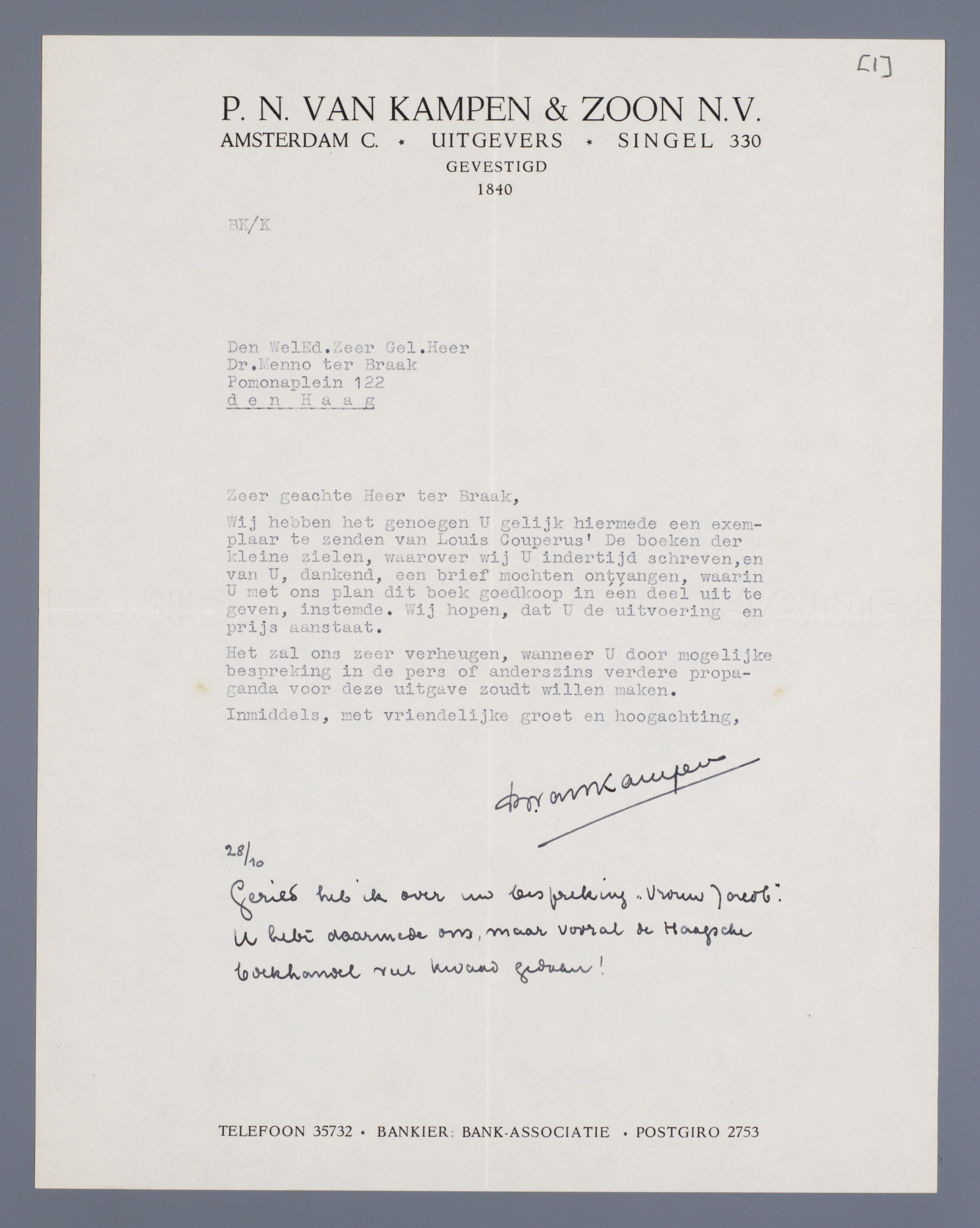 Wij hebben het genoegen U gelijk hiermede een exemplaar te zenden van Louis Couperus' De boeken der kleine zielen, waarover wij U indertijd schreven, en van U, dankend, een brief mochten ontvangen, waarin U met ons plan dit boek goedkoop in één deel uit te geven, instemde. Wij hopen, dat U de uitvoering en prijs aanstaat.