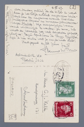 Vandaag ontving ik de V.Bl. en werd door je kostelijk artikel aangenaam herinnerd aan een aangename avond tusschen vuilgroene dennen en marmeren gebruiksvoorwerpen. Hulde! Deze overpeinzingen waren waard vereeuwigd te worden. Ja, man, hier wordt de comedie nog veel beroerder gespeeld, geloof me! Begin April kom ik terug. Dagelijks lijd ik hier onder wat je aan de kaak stelt!