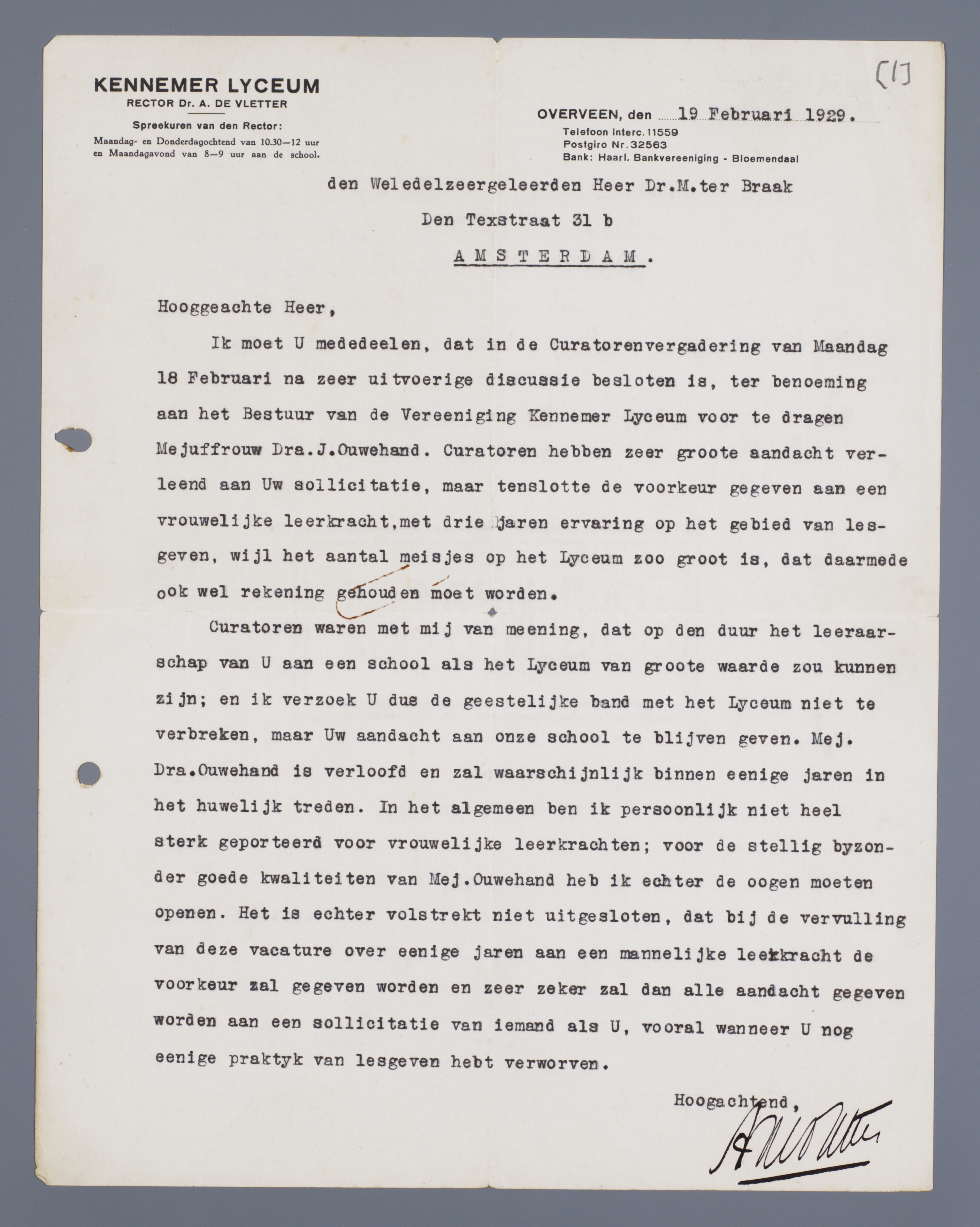 Ik moet U mededeelen, dat in de Curatorenvergadering van Maandag 18 Februari na zeer uitvoerige discussie besloten is, ter benoeming aan het Bestuur van de Vereeniging Kennemer Lyceum voor te dragen Mejuffrouw Drs. J. Ouwehand. Curatoren hebben zeer groote aandacht verleend aan Uw sollicitatie, maar tenslotte de voorkeur gegeven aan een vrouwelijke leerkracht, met drie jaren ervaring op het gebied van lesgeven, wijl het aantal meisjes op het Lyceum zoo groot is, dat daarmede ook wel rekening gehouden moet worden.
