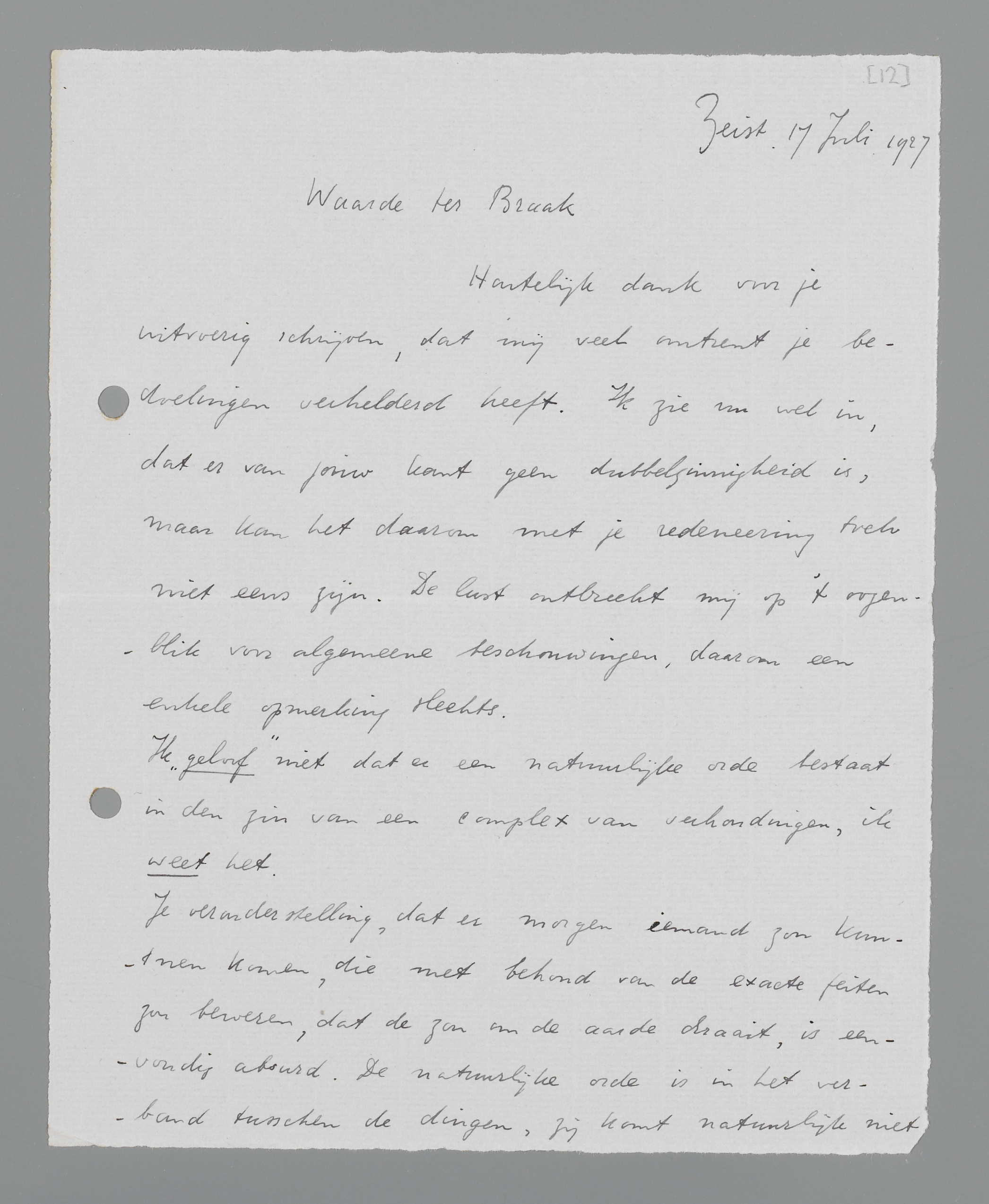 Hartelijk dank voor je uitvoerig schrijven, dat je veel omtrent je bedoelingen verhelderd heeft. Ik zie nu wel in, dat er van jouw kant geen dubbelzinnigheid is, maar kan het daarom met je redeneering toch niet eens zijn. De lust ontbreekt mij op het oogenblik voor algemeene beschouwingen, daarom een enkele opmerking slechts.