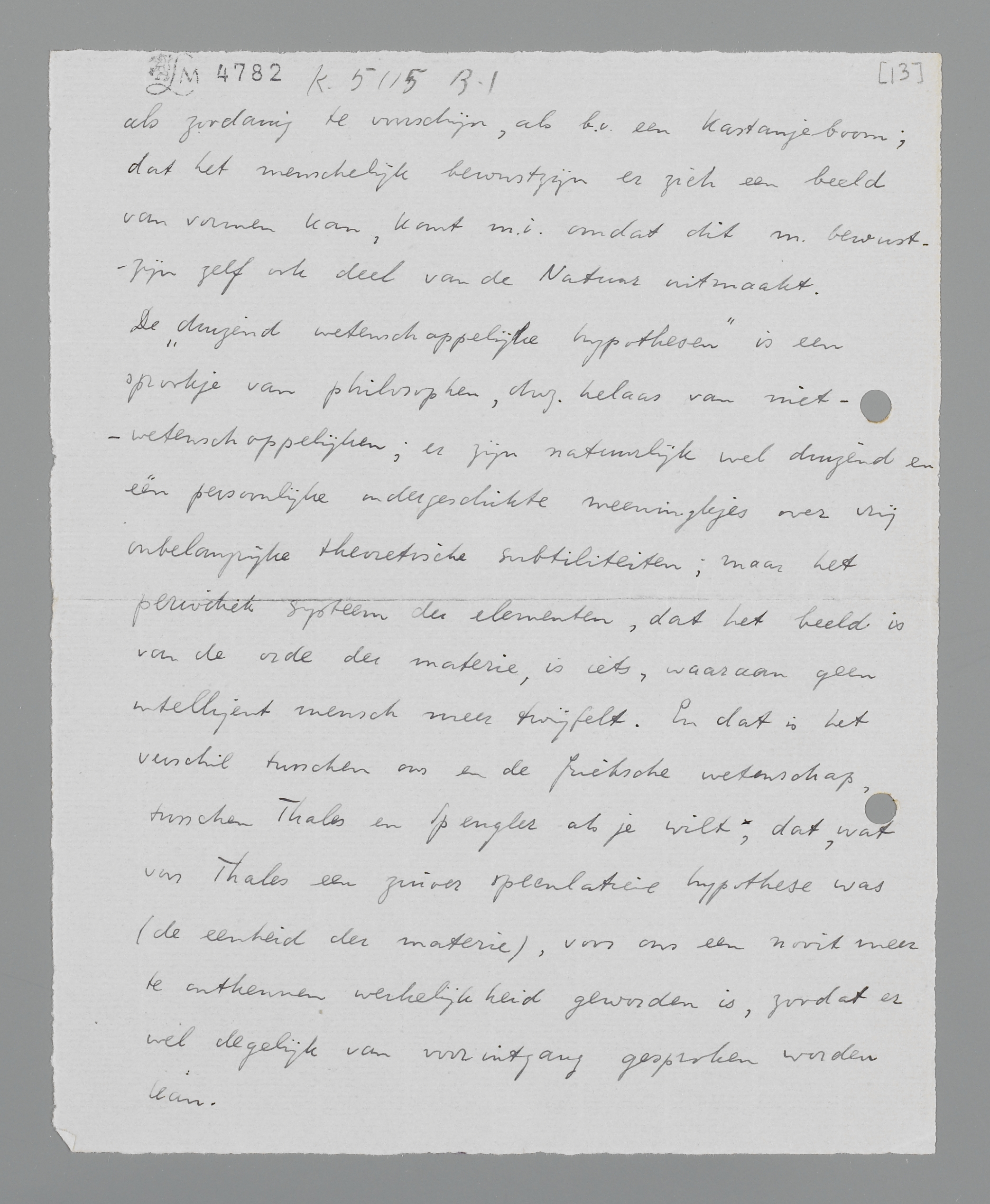 De ‘duizend wetenschappelijke hypothesen’ is een sprookje van philosophen, dwz. helaas van niet-wetenschappelijken; er zijn natuurlijk wel duizend en één persoonlijke ondergeschikte meeninkjes over vrij onbelangrijke theoretische subtiliteiten; maar het periodiek systeem der elementen, dat het beeld is van de orde der materie, is iets, waaraan geen intelligent mensch meer twijfelt. En dat is het verschil tusschen ons en de Grieksche wetenschap, tusschen Thales en Spengler als je wilt, dat, wat voor Thales een zuiver speculatieve hypothese was (de eenheid der materie), voor ons een nooit meer te ontkennen werkelijkheid geworden is, zoodat er wel degelijk van vooruitgang gesproken worden kan.