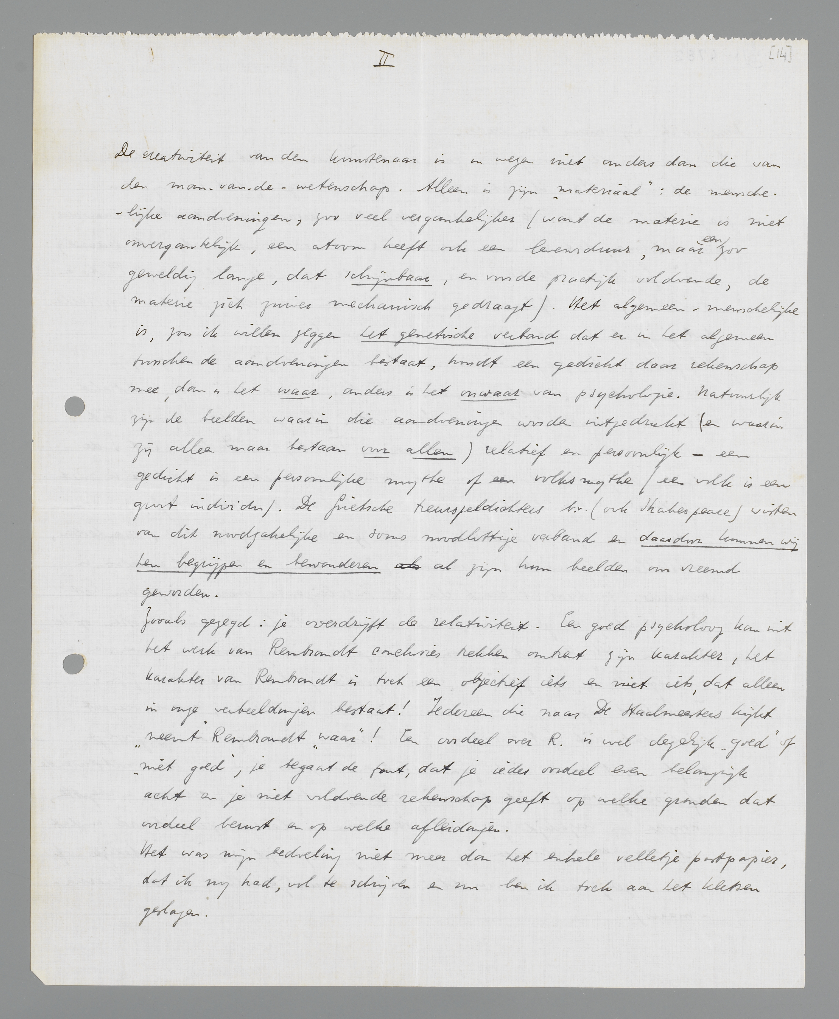 De creativiteit van den kunstenaar is in wezen niet anders dan die van den man-van-de-wetenschap. Alleen is zijn ‘materiaal’: de menschelijke aandoeningen, zoo veel vergankelijker (want de materie is niet onvergankelijk, een atoom heeft ook een levensduur, maar een zoo geweldig lange, dat schijnbaar, en voor de practijk voldoende, de materie zich zuiver mechanisch gedraagt). Het algemeen menschelijke is, zou ik willen zeggen, het genetisch verband dat er in het algemeen tusschen de aandoeningen bestaat, houdt een gedicht daar rekenschap mee, dan is het waar, anders is het onwaar van psychologie. Natuurlijk zijn de beelden waarin die aandoeningen worden uitgedrukt (en waarin zij alleen maar bestaan voor allen) relatief en persoonlijk - een gedicht is een persoonlijke mythe of een volksmythe (een volk is een groot individu). De Grieksche treurspeldichters b.v. (ook Shakespeare) wisten van dit noodzakelijke en soms noodlottige verband en daardoor kunnen wij hen begrijpen en bewonderen al zijn hun beelden ons vreemd geworden.