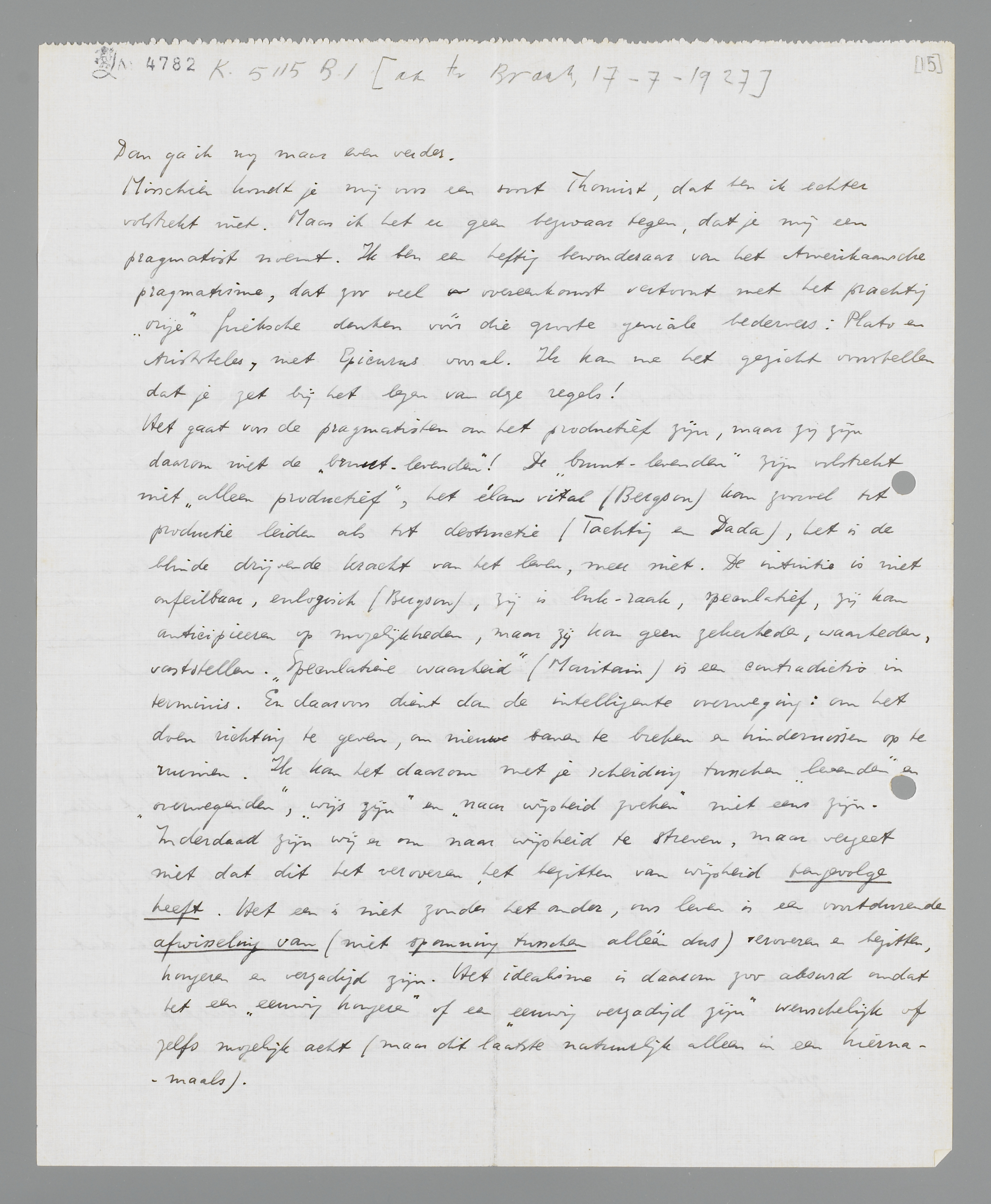 Misschien houdt je mij voor een soort Thomist, dat ben ik echter volstrekt niet. Maar ik heb er geen bezwaar tegen, dat je mij een pragmatist noemt. Ik ben een heftig bewonderaar van het Amerikaansche pragmatisme, dat zoo veel overeenkomst vertoont met het prachtige ‘vrije’ Grieksche denken vóór die groote geniale bedervers Plato en Aristoteles, met Epicurus vooral. Ik kan me het gezicht voorstellen dat je zet bij het lezen van deze regels!