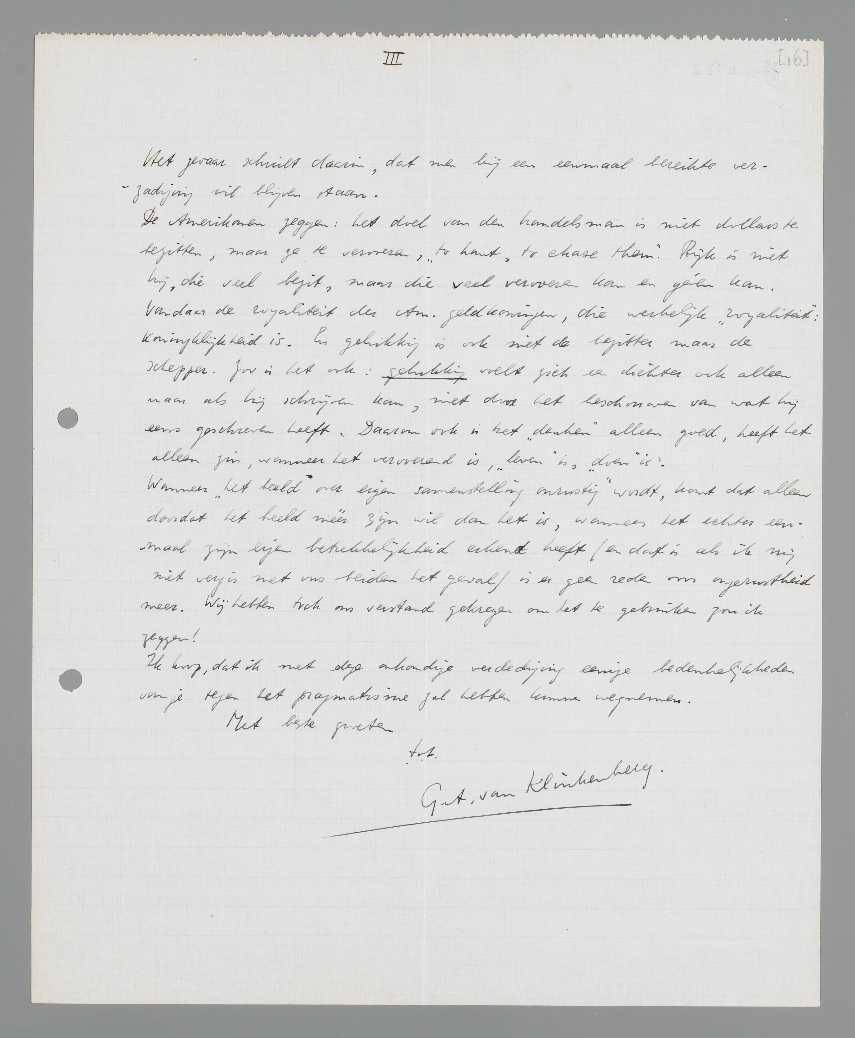 De Amerikanen zeggen: het doel van den handelsman is niet dollars te bezitten, maar ze te veroveren, ‘to hunt, to chase them’. Rijk is niet hij, die veel bezit, maar die veel veroveren kan en géven kan. Vandaar de royaliteit der Am. geldkoningen, die werkelijk ‘royaliteit’, koninklijkheid is. En gelukkig is ook niet de bezitter maar de schepper. Zoo is het ook: gelukkig voelt zich een dichter ook alleen maar als hij schrijven kan, niet door het beschouwen van wat hij eens geschreven heeft. Daarom ook is het ‘denken’ alleen goed, heeft het alleen zin, wanneer het veroverend is, ‘leven’ is, ‘doen’ is.