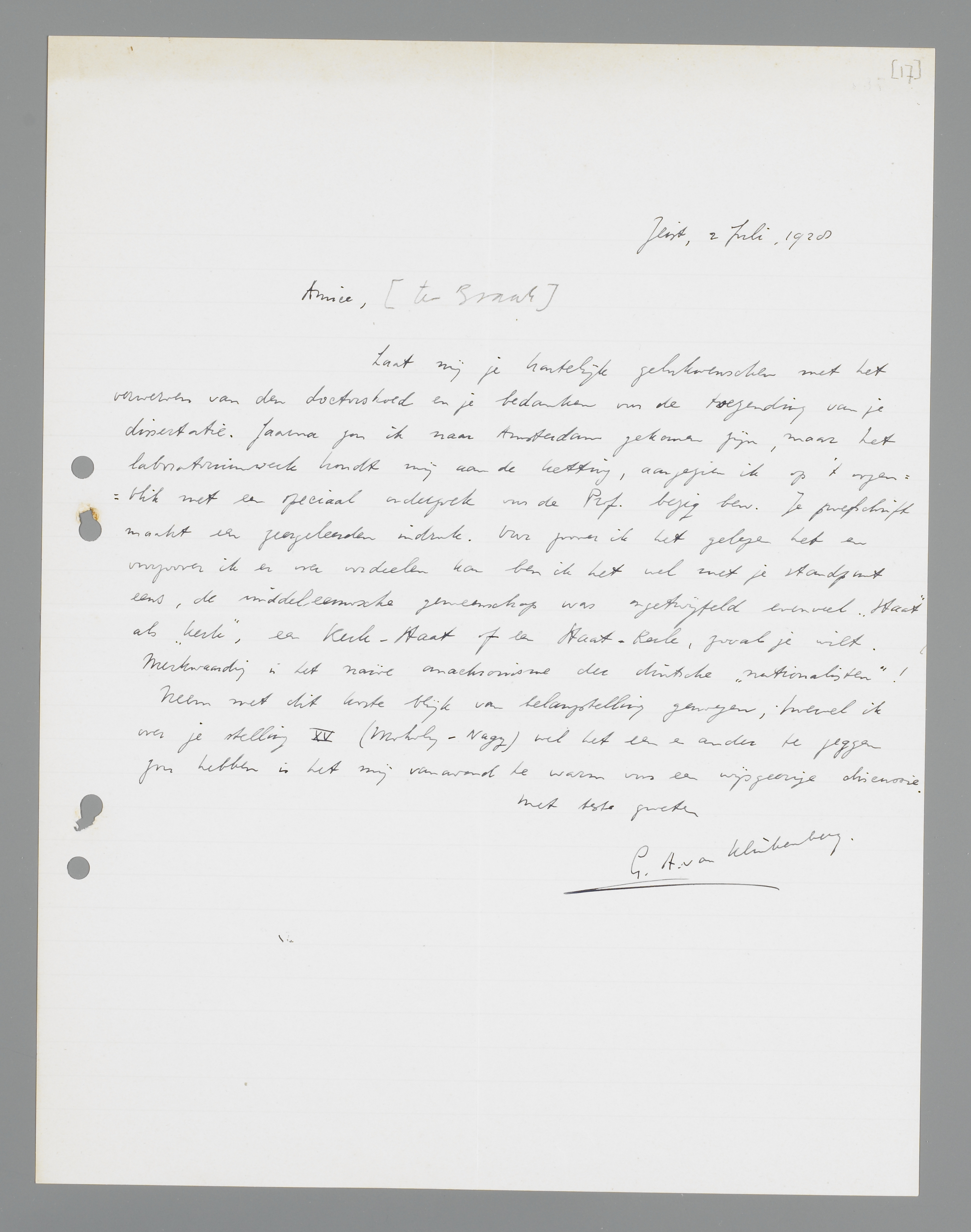 Laat mij je hartelijk gelukwenschen met het verwerven van den doctorshoed en je bedanken voor de toezending van je dissertatie. Gaarne zou ik naar Amsterdam gekomen zijn, maar het laboratoriumwerk houdt mij aan de ketting, aangezien ik op het oogenblik met een speciaal onderzoek van de prof. bezig ben. Je proefschrift maakt een zeergeleerden indruk. Voor zoover ik het gelezen heb en voor zoover ik er over oordeelen kan ben ik het wel met je standpunt eens, de middeleeuwsche gemeenschap was ongetwijfeld evenveel ‘staat’ als ‘kerk’, een kerk-staat of een staat-kerk, zooals je wilt.