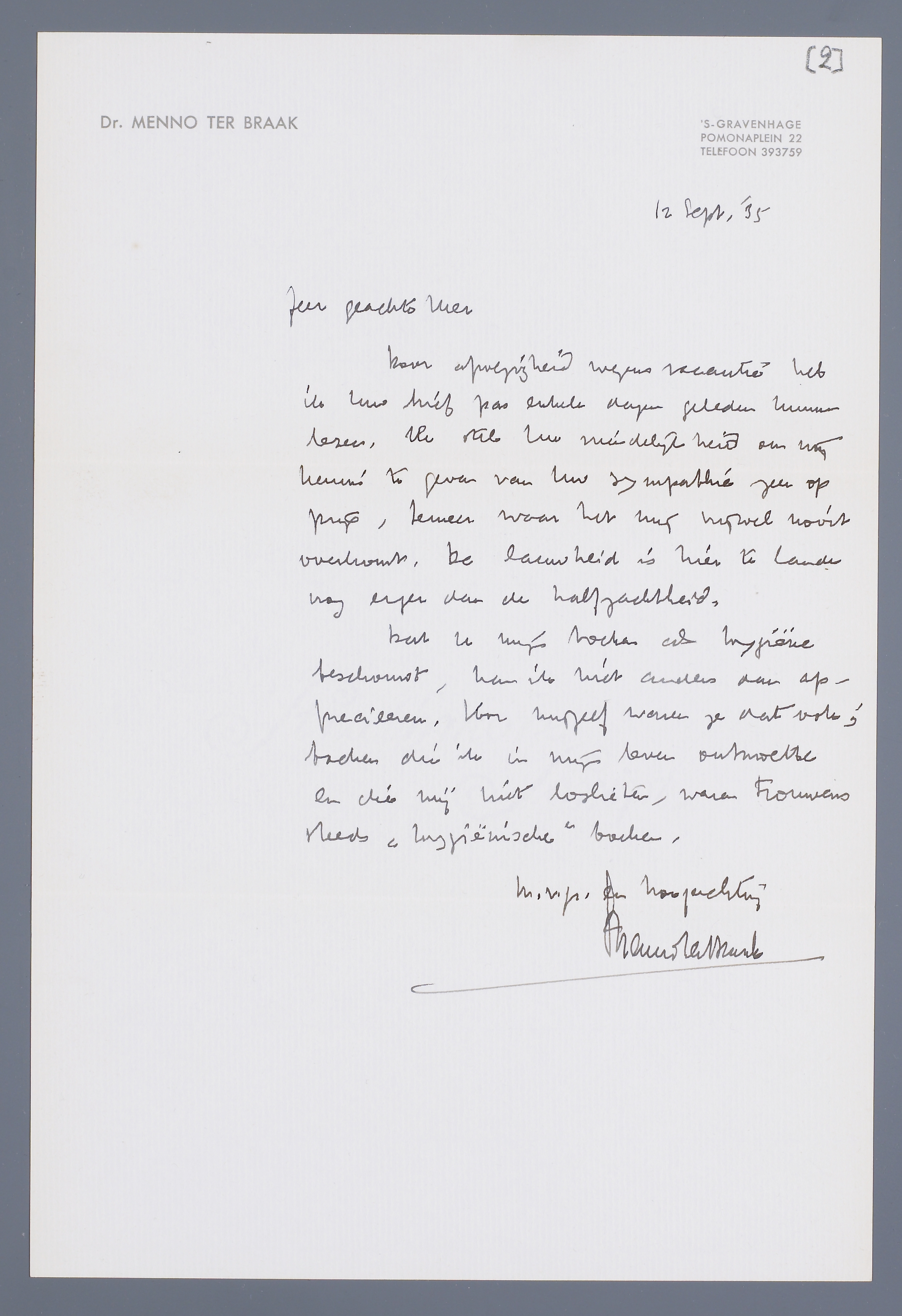 Door afwezigheid wegens vacantie heb ik uw brief pas enkele dagen geleden kunnen lezen. Ik stel uw vriendelijkheid om mij kennis te geven van uw sympathie zeer op prijs, temeer waar het mij vrijwel nooit overkomt. De lauwheid is hier te lande nog erger dan de halfzachtheid.