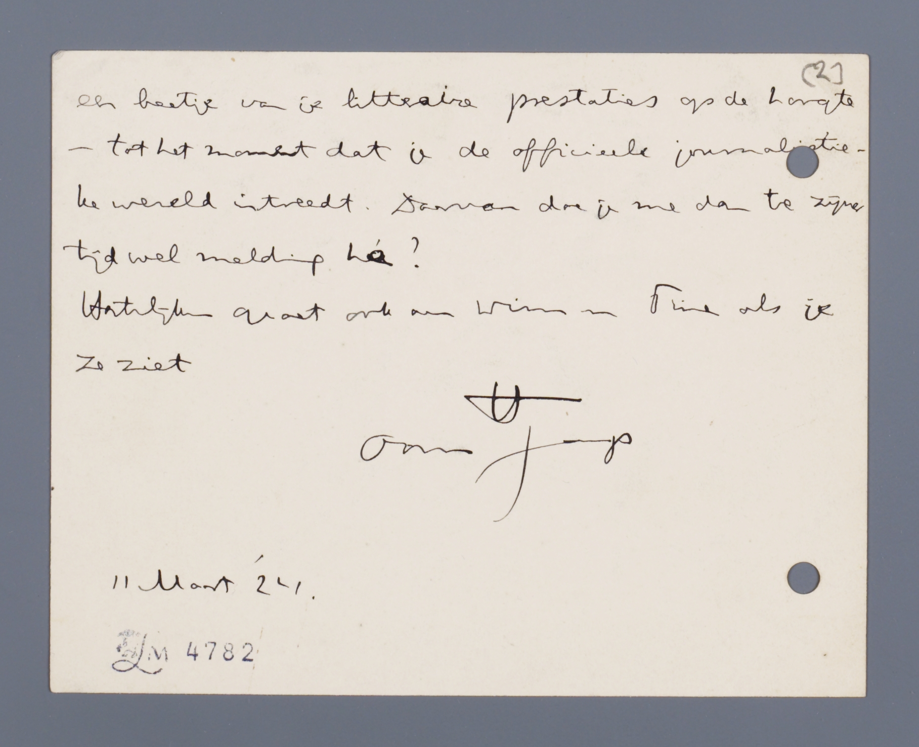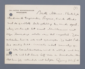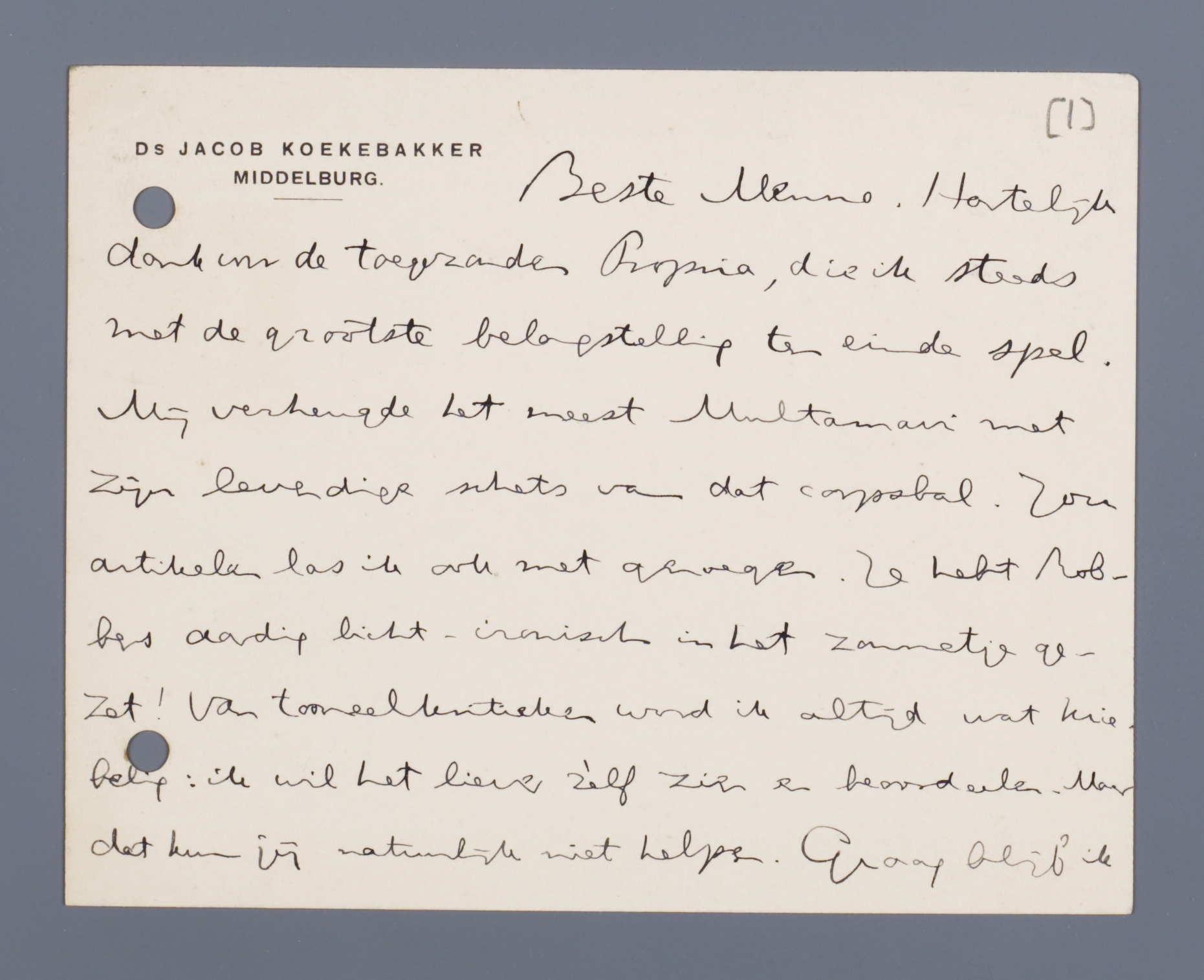 Hartelijk dank voor de toegezonden Propria, die ik steeds met de grootste belangstelling ten einde spel. Mij verheugde het meest Multamavi met zijn levendige schets van dat corpsbal. Jou artikelen las ik ook met genoegen. Je hebt Robbers aardig licht-ironisch in het zonnetje gezet! Van tooneelkritieken word ik altijd wat kriebelig: ik wil het liever zèlf zien en beoordeelen. Maar dat kun jij natuurlijk niet helpen. Graag blijf ik een beetje van je litteraire prestaties op de hoogte - tot het moment dat je de officieele journalistieke wereld intreedt. Daarvan doe je me dan te zijner tijd wel melding hè?