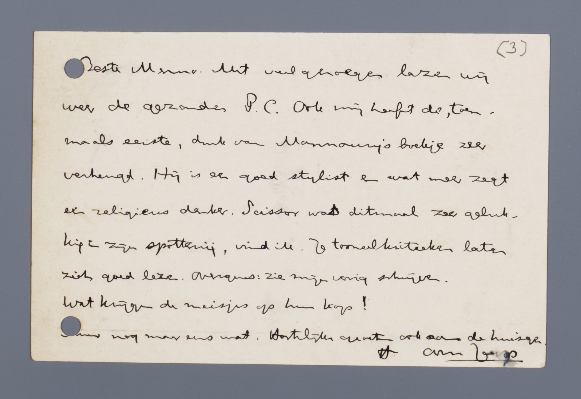Met veel genoegen lazen wij weer de gezonden P.C. Ook mij heeft de, toenmaals eerste, druk van Mannoury's boekje zeer verheugd. Hij is een goed stylist en wat meer zegt een religieus denker. Scissor was ditmaal zeer gelukkig in zijn spotterij, vind ik. Je tooneelkritieken laten zich goed lezen. Overigens: zie mijn vorig schrijven.