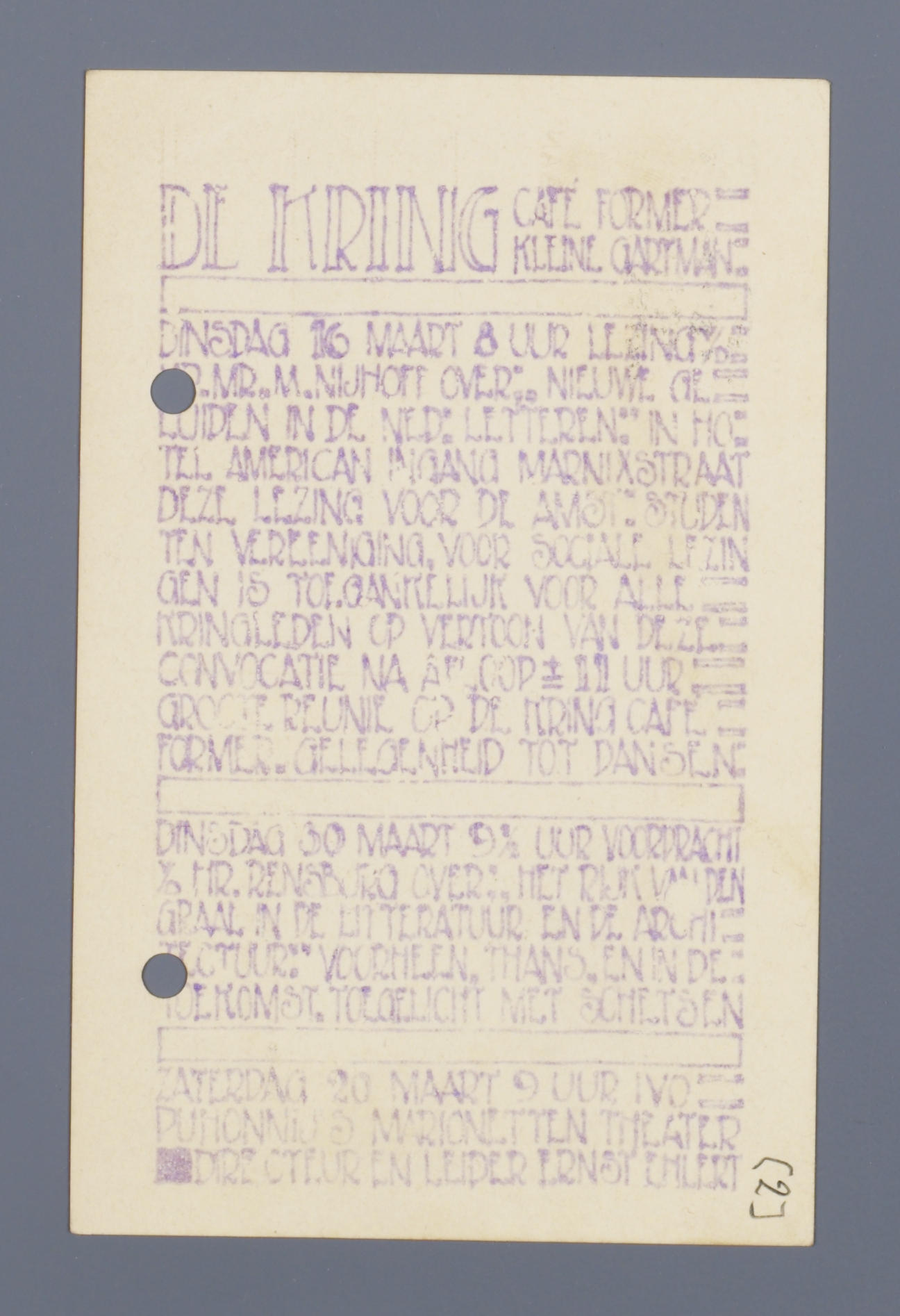 Dinsdag 16 maart 8 uur lezing v/d Hr. Mr. M. Nijhoff over: nieuwe geluiden in de Ned. Letteren: in Hotel American ingang Marnixstraat. Deze lezing voor de Amst. Studentenvereeniging voor sociale lezingen is toegankelijk voor alle kringleden op vertoon van deze convocatie. Na afloop ± 11 uur groote réunie op de kring café Former. Gelegenheid tot dansen.