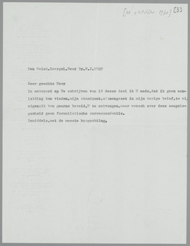 In antwoord op uw schrijven van 19 dezer deel ik U mede, dat ik geen aanleiding kan vinden, mijn standpunt, uiteengezet in mijn vorige brief, te wijzigen; ik ben gaarne bereid, U te ontvangen, maar wensch over deze aangelegenheid geen formalistische correspondentie.