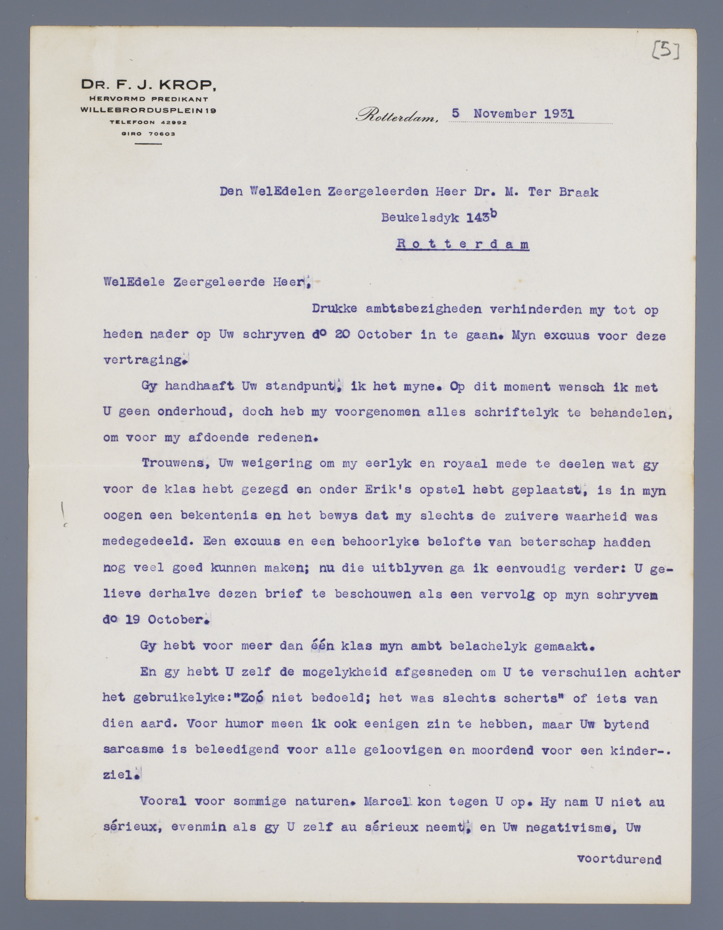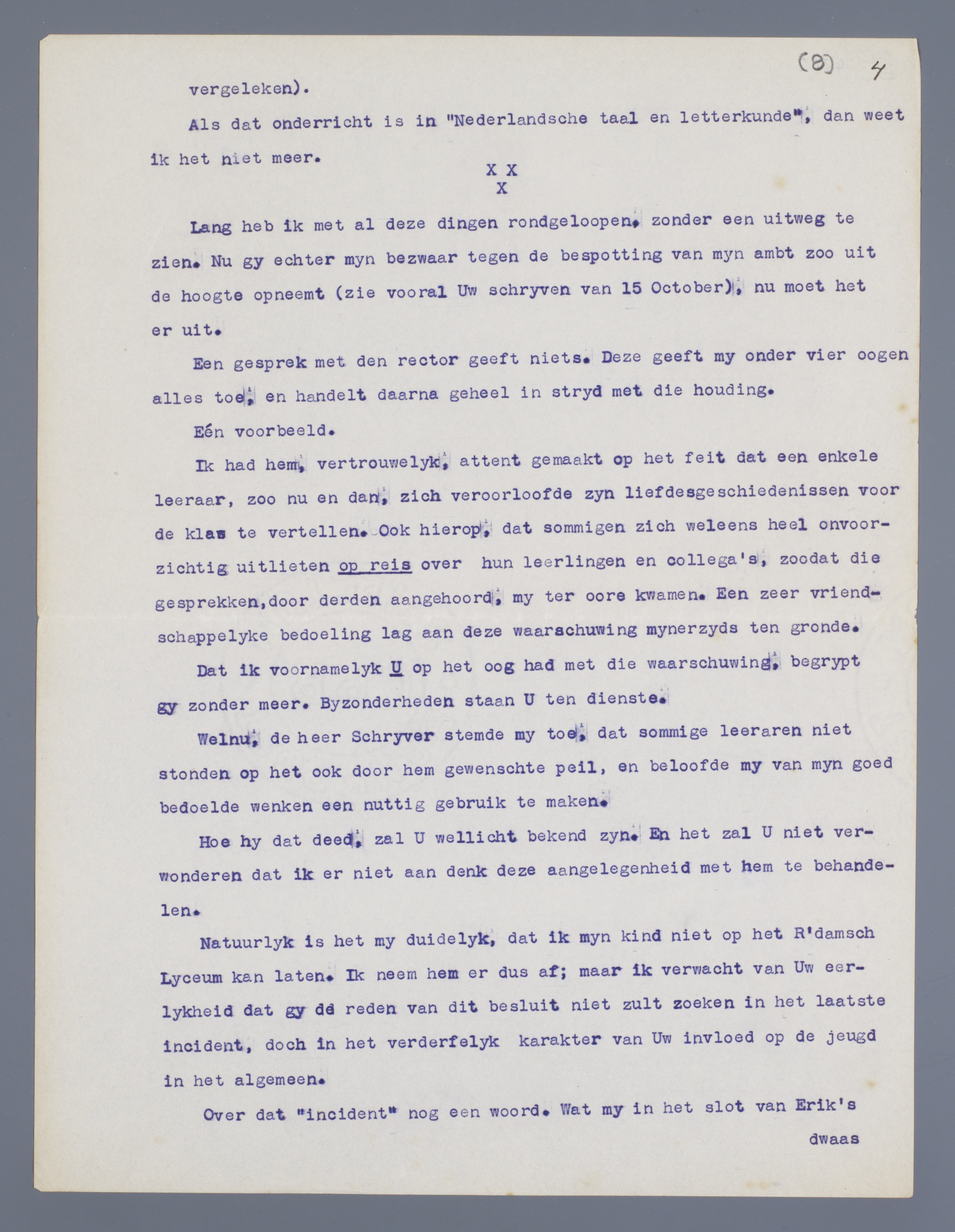 Trouwens, Uw weigering om my eerlijk en royaal mede te deelen wat gy voor de klas hebt gezegd en onder Erik's opstel hebt geplaatst, is in mijn oogen een bekentenis en het bewys dat mij slechts zuivere waarheid was medegedeeld. Een excuus en een behoorlyke belofte van beterschap hadden nog veel goed kunnen maken; nu die uitblyven ga ik eenvoudig verder: U gelieve derhalve dezen brief te beschouwen als een gevolg op mijn schrijven do 19 October.