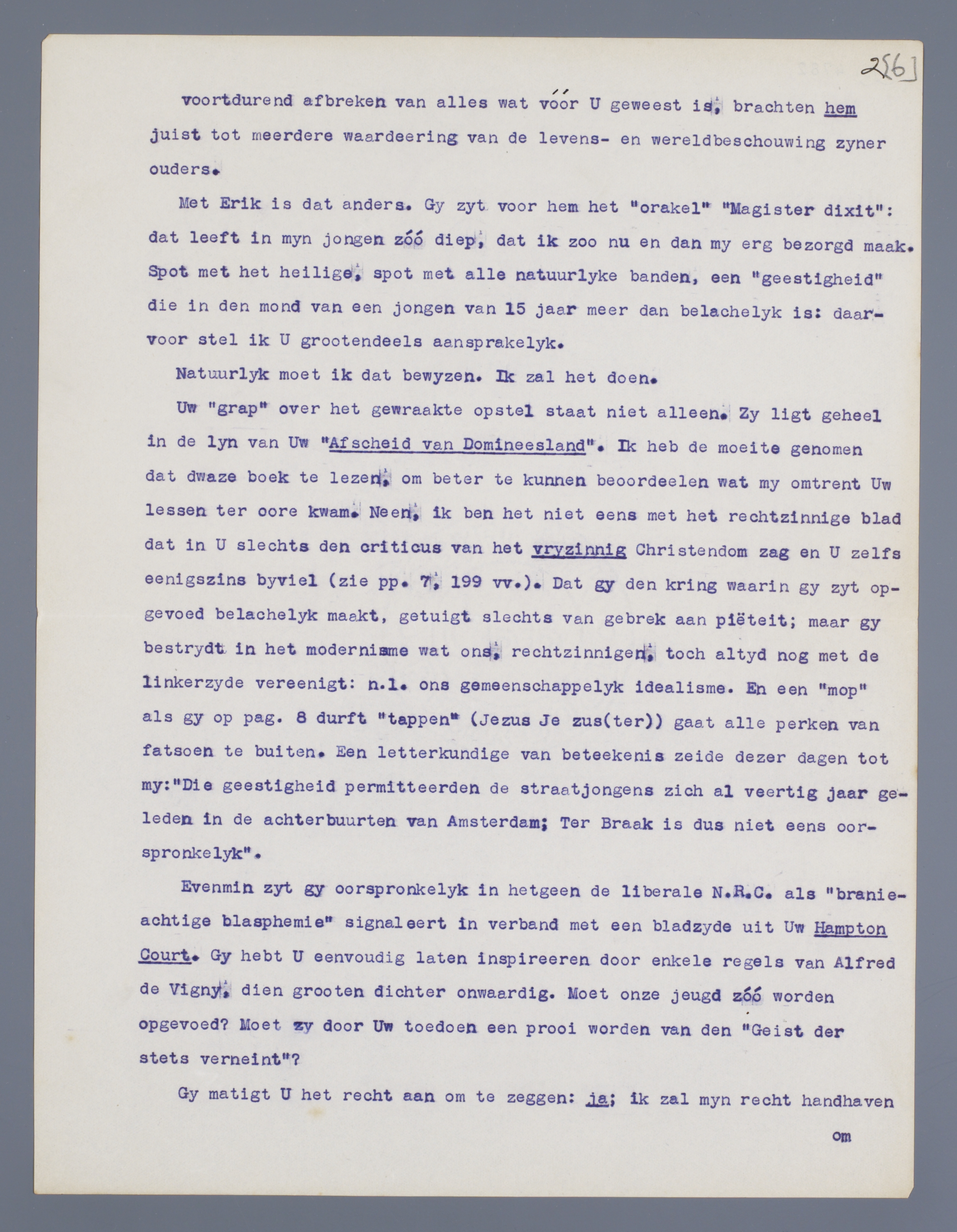 Evenmin zyt gij oorspronkelyk in hetgeen de liberale N.R.C. als ‘branie-achtige blasphemie’ signaleert in verband met een bladzyde uit Uw Hampton Court. Gy hebt U eenvoudig laten inspireeren door enkele regels van Alfred de Vigny, dien grooten dichter onwaardig. Moet onze jeugd zóó worden opgevoed? Moet zy door Uw toedoen een prooi worden van den ‘Geist der stets verneint’?