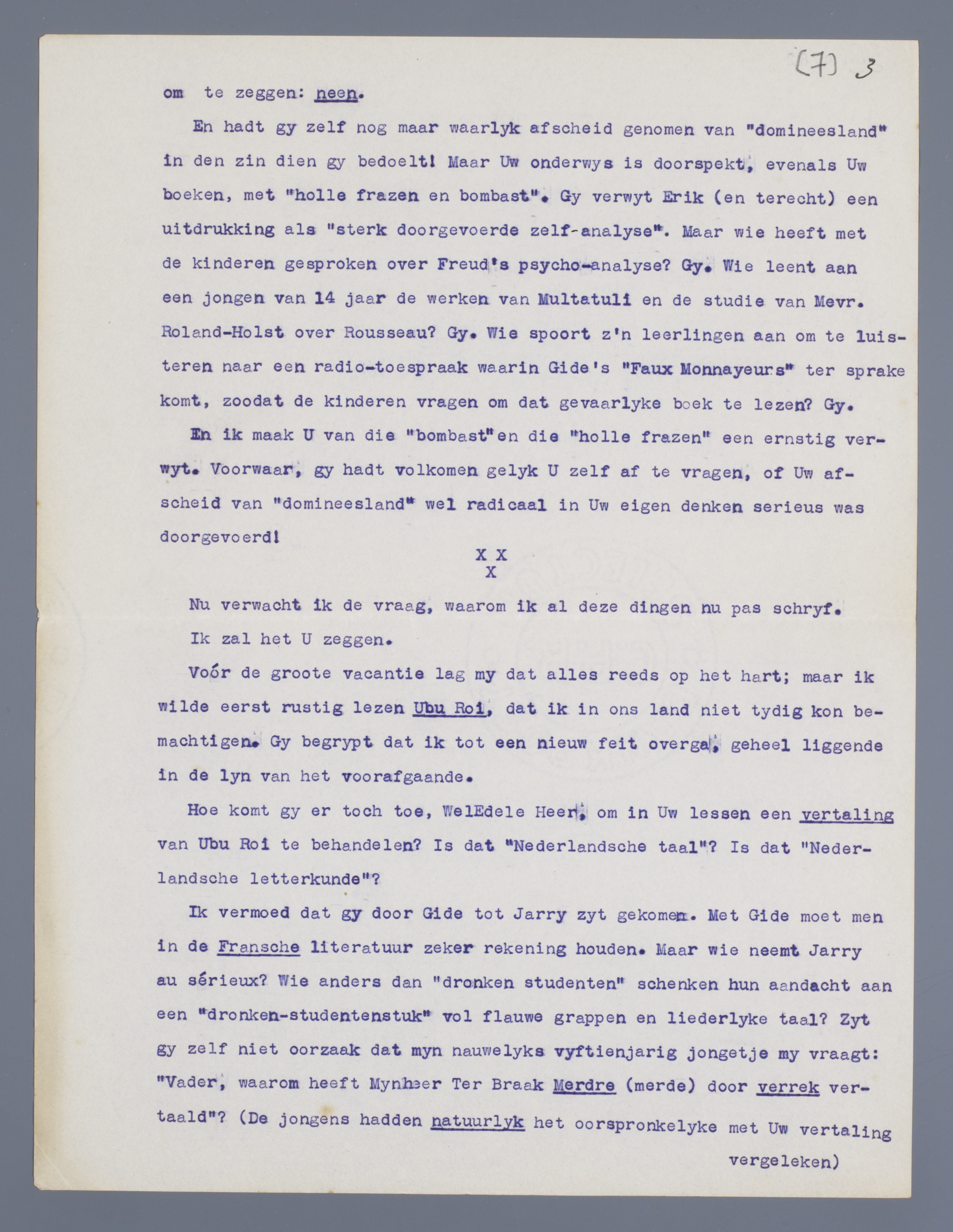 Ik vermoed dat gy door Gide tot Jarry zyt gekomen. Met Gide moet men in de Fransche literatuur zeker rekening houden. Maar wie neemt Jarry au sérieux? Wie anders dan ‘dronken studenten’ schenken hun aandacht aan een ‘dronken-studentenstuk’ vol flauwe grappen en liederlyke taal? Zyt gy zelf niet oorzaak dat myn nauwelijks vyftienjarig jongetje my vraagt: ‘Vader, waarom heeft Mijnheer Ter Braak Merdre (merde) door verrek vertaald’? (De jongens hadden natuurlyk het oorspronkelyke met Uw vertaling vergeleken).