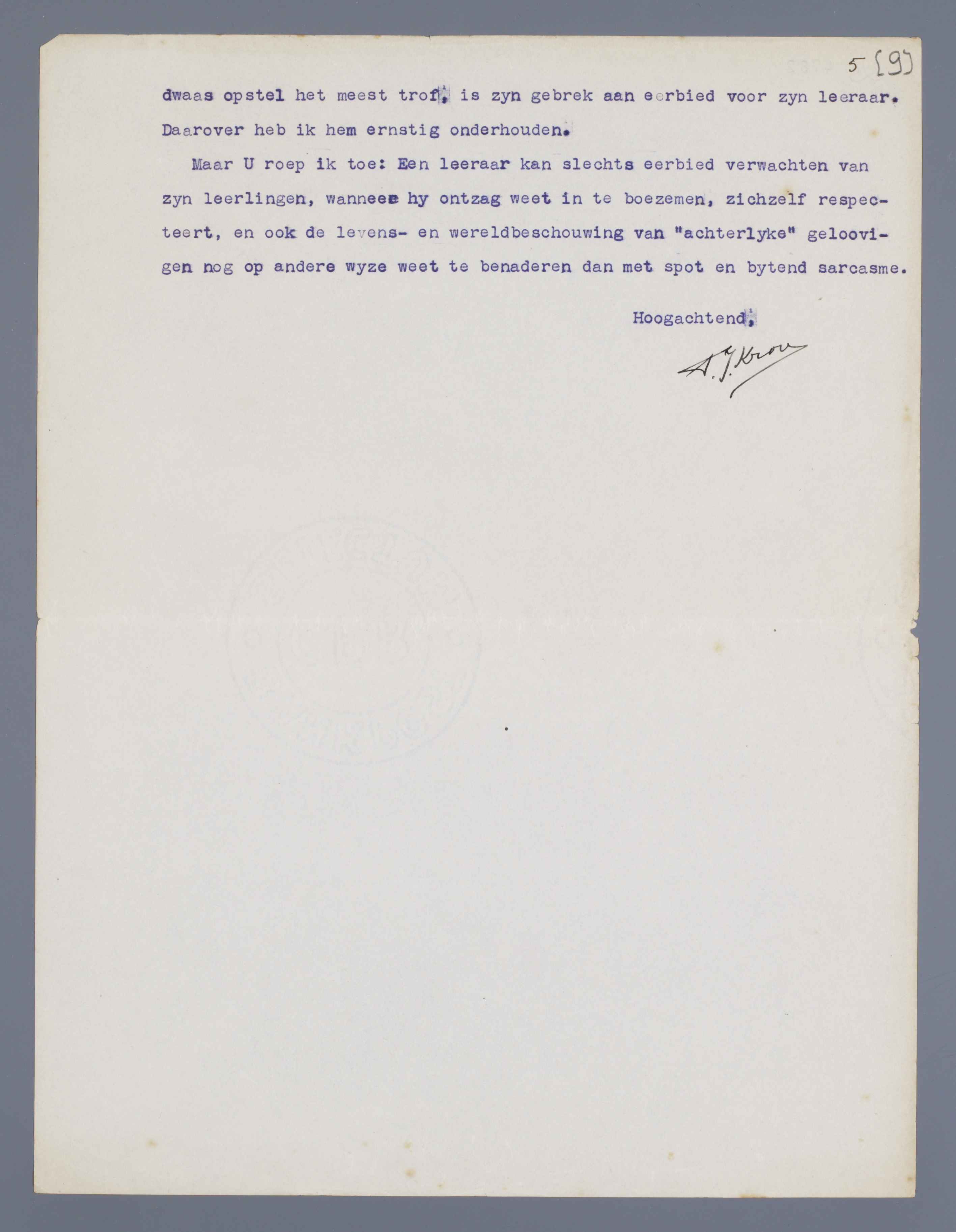 Maar U roep ik toe: Een leeraar kan slechts eerbied verwachten van zyn leerlingen, wanneer hij ontzag weet in te boezemen, zichzelf respecteert, en ook de levens- en wereldbeschouwing van ‘achterlyke’ geloovigen nog op andere wyze weet te benaderen dan met spot en bytend sarcasme.