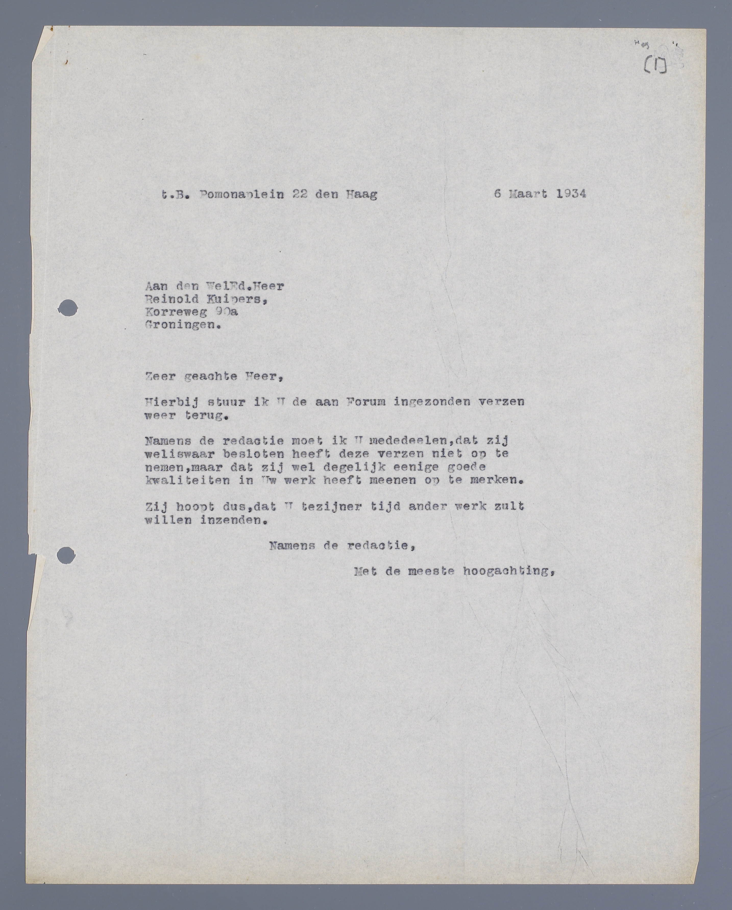 Zij hoopt dus, dat U tezijner tijd ander werk zult willen inzenden.