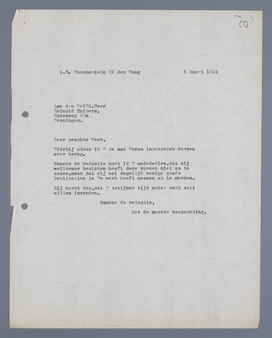 Namens de redactie moet ik U mededeelen, dat zij weliswaar besloten heeft deze verzen niet op te nemen, maar dat zij wel degelijk eenige goede kwaliteiten in Uw werk heeft meenen op te merken.