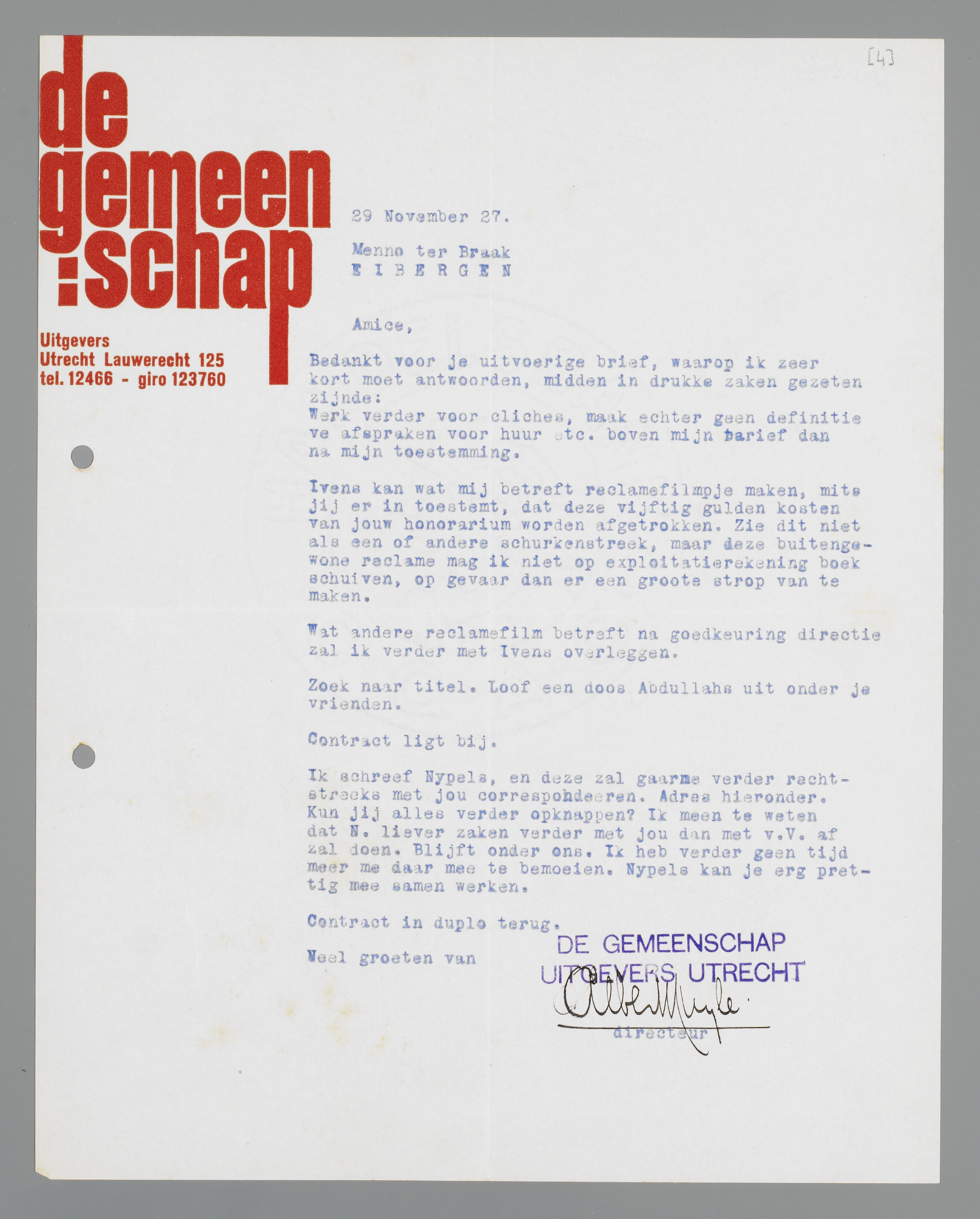 Ivens kan wat mij betreft reclamefilmpje maken, mits jij er in toestemt, dat deze vijftig gulden kosten van jouw honorarium worden afgetrokken. Zie dit niet als een of andere schurkenstreek, maar deze buitengewone reclame mag ik niet op exploitatierekening boek schuiven, op gevaar dan er een groote strop van te maken.