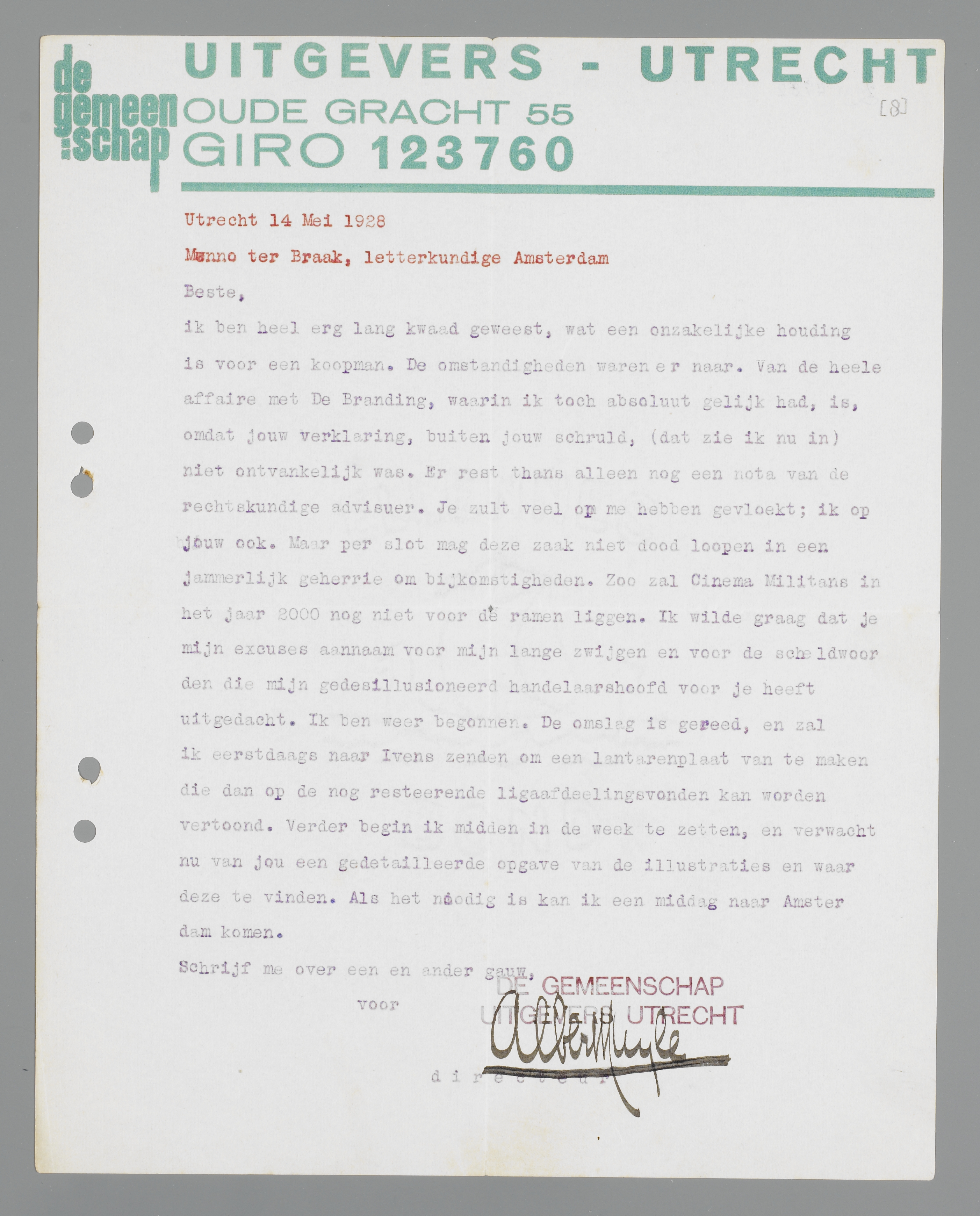 ik ben heel erg lang kwaad geweest, wat een onzakelijke houding is voor een koopman. De omstandigheden waren er naar. Van de heele affaire met De Branding, waarin ik toch absoluut gelijk had, is, omdat jouw verklaring, buiten jouw schuld, (dat zie ik nu in) niet ontvankelijk was. Er rest thans alleen nog een nota van de rechtskundige adviseur. Je zult veel op me hebben gevloekt; ik op jou ook. Maar per slot mag deze zaak niet dood loopen in een jammerlijk geherrie om bijkomstigheden. Zoo zal Cinema Militans in het jaar 2000 nog niet voor de ramen liggen. Ik wilde graag dat je mijn excuses aannam voor mijn lange zwijgen en voor de scheldwoorden die mijn gedesillusioneerd handelaarshoofd voor je heeft uitgedacht. Ik ben weer begonnen. De omslag is gereed, en zal ik eerstdaags naar Ivens zenden om een lantarenplaat van te maken die dan op de nog resteerende ligaafdeelingsavonden kan worden vertoond. Verder begin ik midden in deze week te zetten, en verwacht nu van jou een gedetailleerde opgave van de illustraties en waar deze te vinden. Als het noodig is kan ik een middag naar Amsterdam komen.
