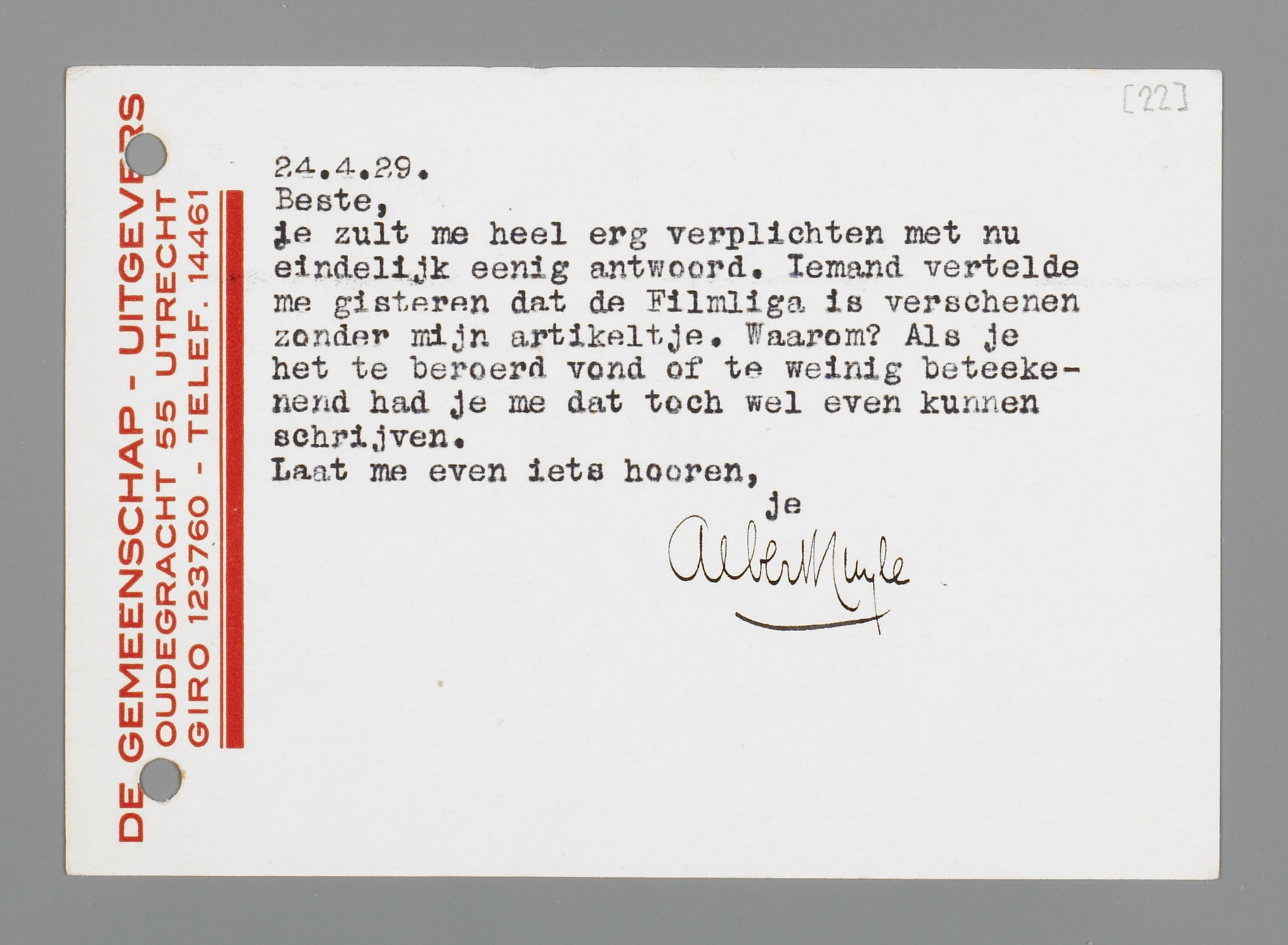je zult me heel erg verplichten met nu eindelijk eenig antwoord. Iemand vertelde me gisteren dat de Filmliga is verschenen zonder mijn artikeltje. Waarom? Als je het te beroerd vond of te weinig beteekenend had je me dat toch wel even kunnen schrijven.