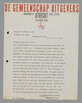 door omstandigheden van zeer uiteenloopenden aard bleef tot op heden Uw brief d.d. 8 November 1930 zonder gevolg. Intusschen hebben belangrijke wijzigingen in onze firma plaats gegrepen. Wijzigingen van een dusdanig ingrijpende aard dat een zekere rechtmatige ontevredenheid welke misschien ook bij U ten opzichte van onze firma bestond, naar wij durven aannemen spoedig zal verdwijnen. Wij hopen dan ook van harte dat U in het vervolg onze firma wederom met een groot vertrouwen tegenover zult willen staan, en onze eventueele uitgeversdiensten zult willen gebruik maken. Inliggend gelieve U aan te treffen een afrekening van Uw boek CINEMA MILITANS over het tijdvak 31 Juni 1930 tot 31 December van hetzelfde jaar. Nadat wij het duplicaat geteekend hebben retour ontvangen zullen wij U het saldo ten Uwen gunste (saldo 31 Dec. 1930 ad Fl.5.25 en Fl.10.00 van honor. bon nr. 125) ad Fl.15.25 voor of 15 Maart a.s. overmaken.