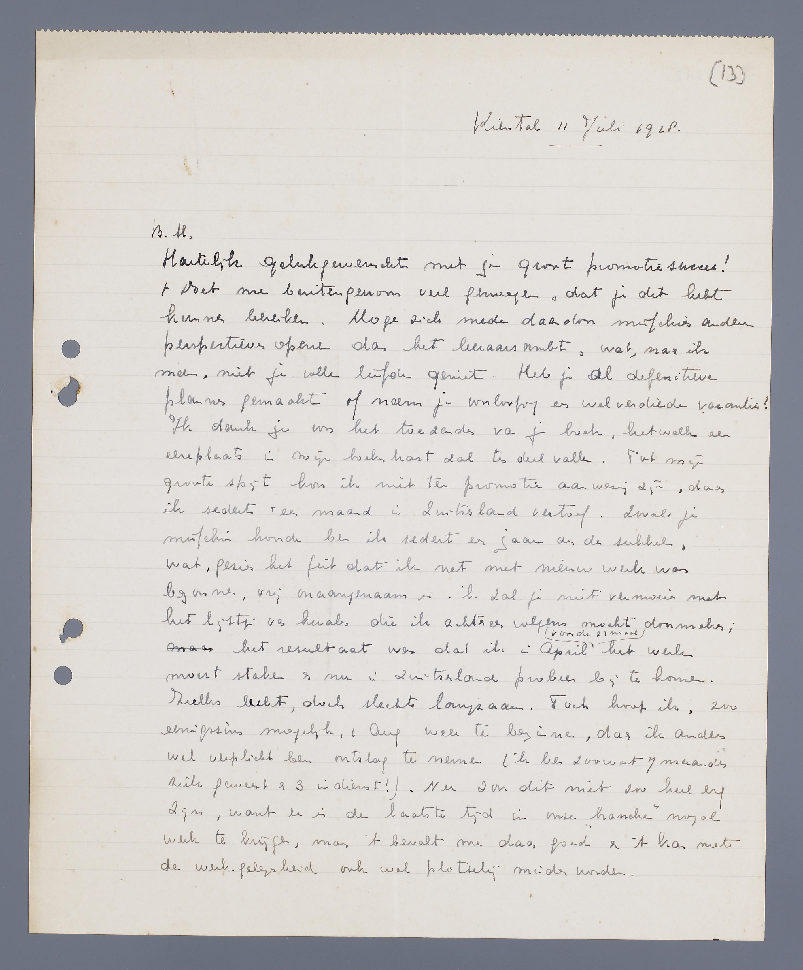 Hartelijk gelukgewenscht met je groot promotiesucces! 't Doet me buitengewoon veel genoegen, dat je dit hebt kunnen bereiken. Moge zich mede daardoor misschien andere perspectieven openen dan het leeraarsambt, wat, naar ik meen, niet je volle liefde geniet. Heb je al definitieve plannen gemaakt of neem je voorloopig een wel verdiende vacantie? Ik dank je voor het toezenden van je boek, hetwelk een eereplaats in mijn boekenkast zal ten deel vallen. Tot mijn groote spijt kon ik niet ter promotie aanwezig zijn, daar ik sedert een maand in Zwitserland vertoef. Zooals je misschien hoorde ben ik sedert een jaar aan de sukkel, wat, gezien het feit dat ik net met nieuw werk was begonnen, vrij onaangenaam is. 'k Zal je niet vermoeien met het lijstje van kwalen die ik achtereenvolgens mocht doormaken; het resultaat was dat ik in April voor de 2e maal het werk moest staken en nu in Zwitserland probeer bij te komen. Zulks lukt, doch slechts langzaam. Toch hoop ik, zoo eenigszins mogelijk, 1 Aug weer te beginnen, daar ik anders wel verplicht ben ontslag te nemen (ik ben zoowat 7 maanden ziek geweest en 3 in dienst!). Nu zou dit niet zoo heel erg zijn, want er is de laatste tijd in onze ‘branche’ nogal werk te krijgen, maar 't bevalt me daar goed en 't kan met de werkgelegenheid ook wel plotseling minder worden.