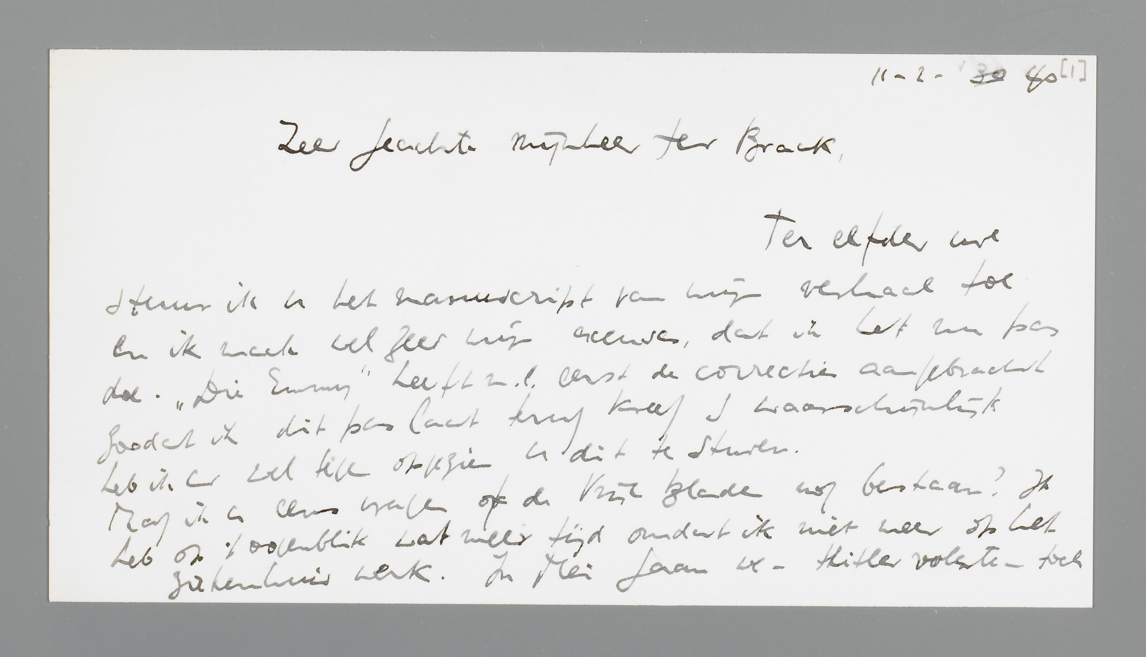 Ter elfder ure stuur ik u het manuscript van mijn verhaal toe en ik maak wel zeer mijn excuses, dat ik het nu pas doe. ‘Die Emmy’ heeft n.l. eerst de correctie aangebracht zoodat ik dit pas laat terug kreeg en waarschijnlijk heb ik er wel tegen opgezien u dit te sturen.