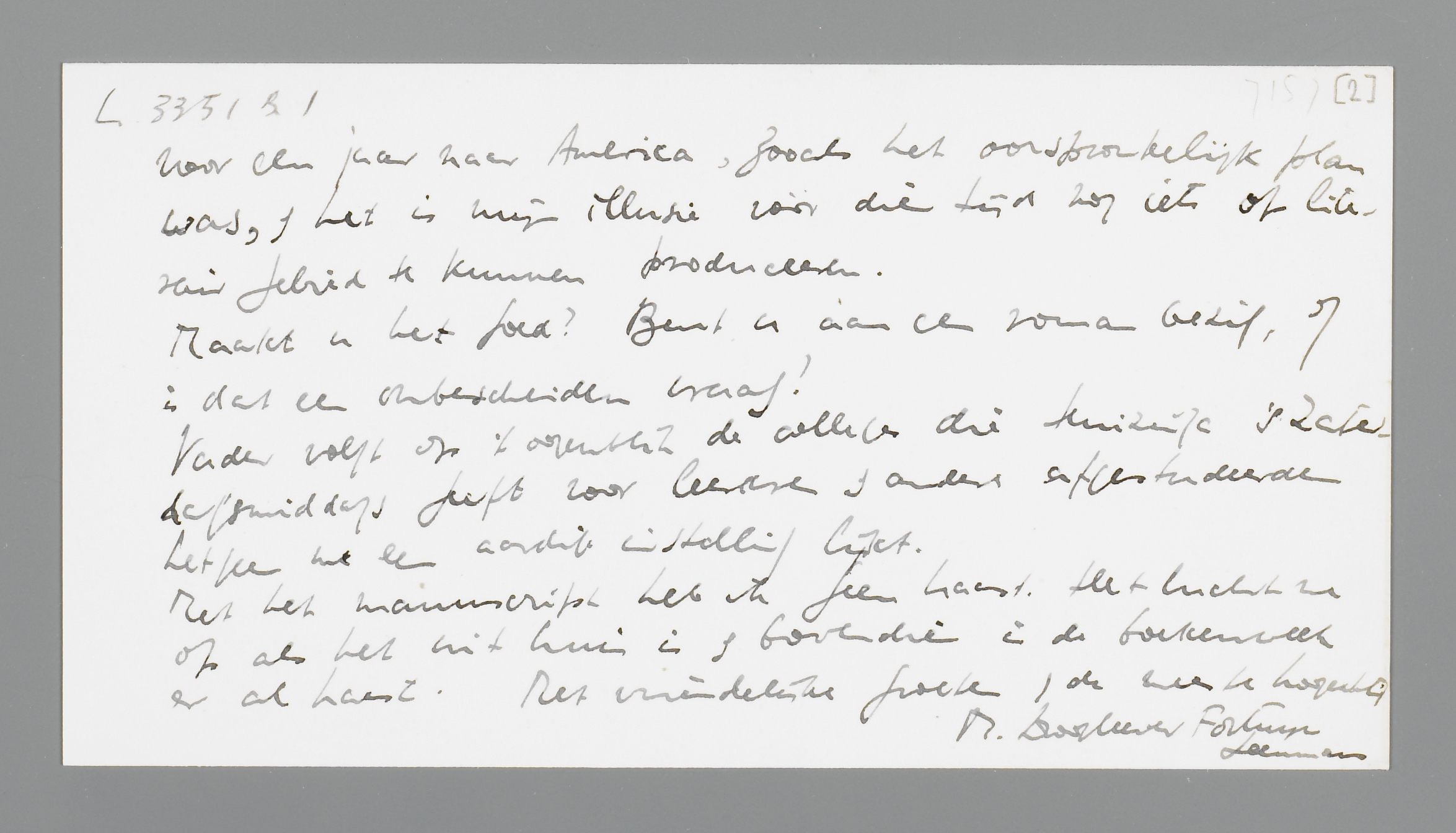 Mag ik u eens vragen of de Vrije Bladen nog bestaan? Ik heb op 't oogenblik wat meer tijd omdat ik niet meer op het ziekenhuis werk. In Mei gaan we - Hitler volente - toch voor een jaar naar America, zooals het oorspronkelijk plan was, het is mijn illusie vòòr die tijd nog iets op literair gebied te kunnen produceeren.