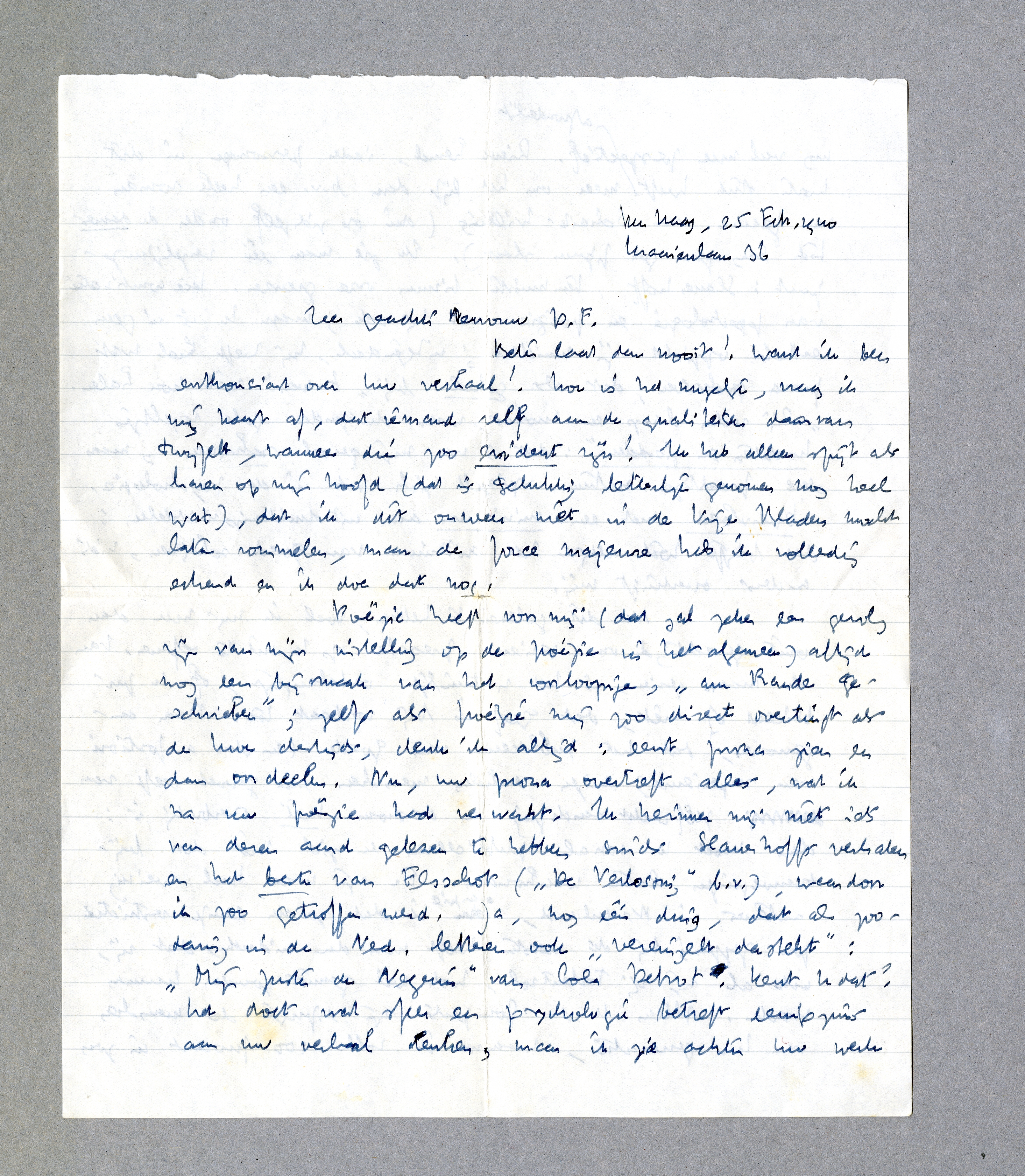 Inderdaad, de Vrije Bladen bestaan nog. Zoojuist verscheen ‘Catastrofe der Scholastiek’ van Gomperts, waar mee ik erg in mijn schik ben: in Januari gaven wij een bundeltje van Lehmann uit (‘Subjectieve Reportage’): een ‘nur’-dichter, een soort phaenomeen van 19 jaar, maar overigens een wezen, waarvoor ik geen hand in het vuur zou steken. Hij kan misschien plotseling, à la Rimbaud, uit elkaar ploffen, of gaga worden. De Vrije Bladen bestaan dus nog, maar ik vrees, dat daaruit nog niet volgt, dat U mij ook iets stuurt. De ervaring leerde mij, dat U (evenals ondergeteekende trouwens) wat traag is in de correspondentie. Van Uw moeder hoorde ik telefonisch, dat U misschien Donderdag in Den Haag bent. In dat geval hoop ik, dat U mij opbelt, opdat ik U weer eens een mondelinge belofte kan afpersen. Weliswaar meen ik ’s avonds door de Boekenweek ex officio bezet te zijn, maar ’s middags ben ik zeker vrij.