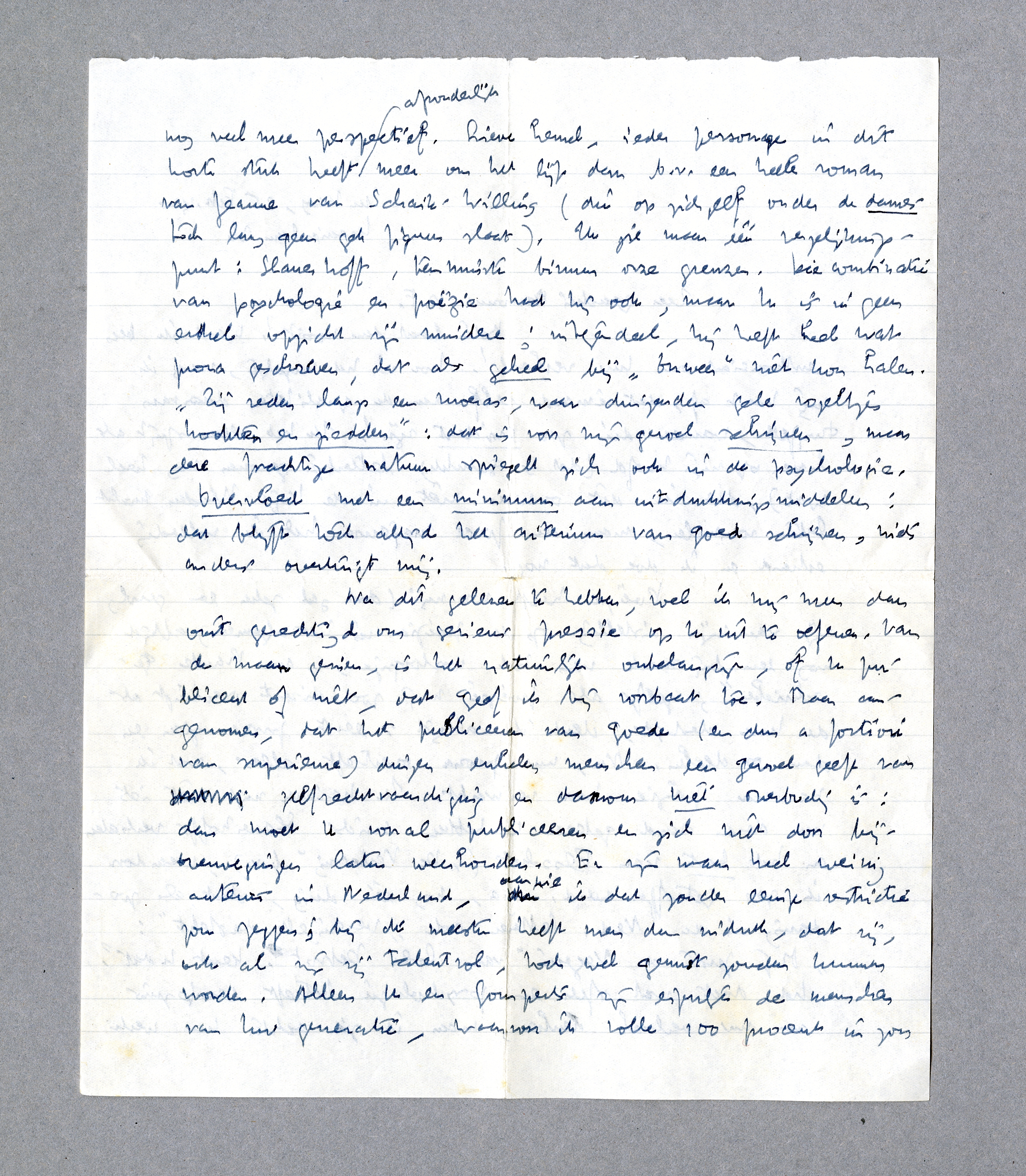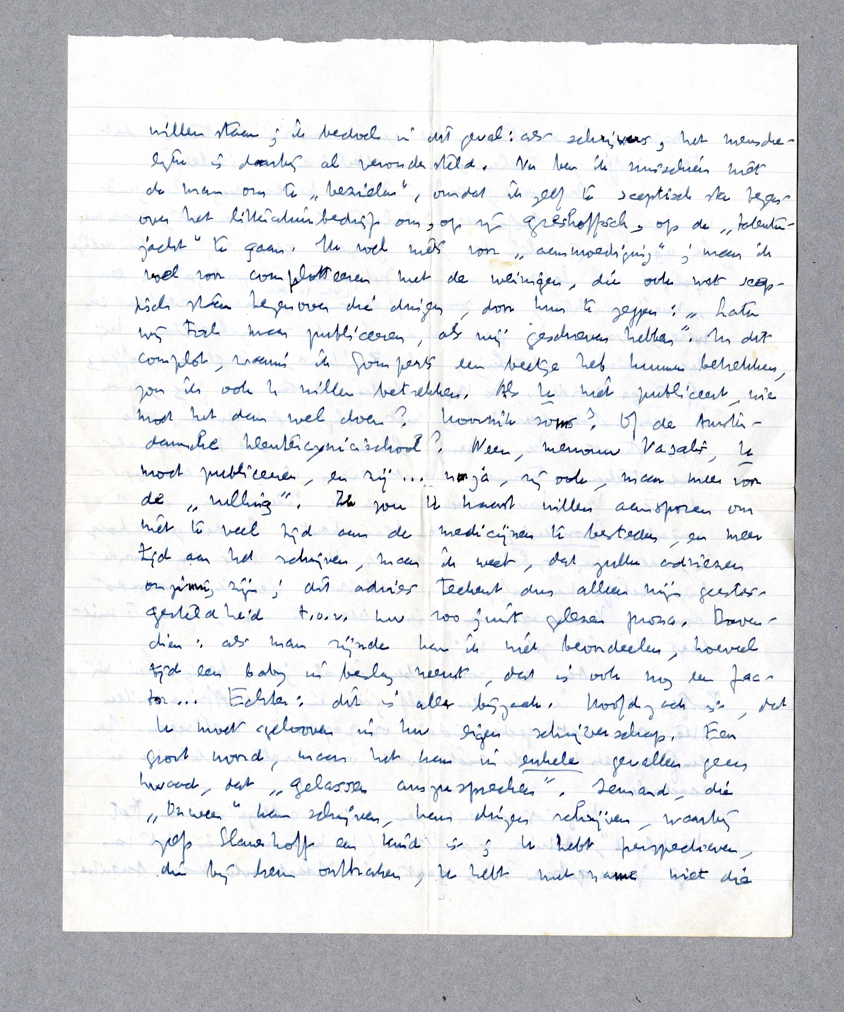 Na dit gelezen te hebben, voel ik mij meer dan ooit gerechtigd om serieus pressie op U uit te oefenen. Van de maan gezien, is het natuurlijk onbelangrijk, of u publiceert of niet, dat geef ik bij voorbaat toe. Maar aangenomen, dat het publiceeren van goede (en dus a fortiori van superieure) dingen enkele menschen een gevoel geeft van zelfrechtvaardiging en daarom niet overbodig is: dan moet U vooral publiceren en zich niet door bij-overwegingen laten weerhouden. Er zijn maar heel weinig auteurs in Nederland, van wie ik dat zonder eenige restrictie zou zeggen; bij de meesten heeft men den indruk, dat zij, ook al zijn zij talentvol, toch wel gemist zouden kunnen worden. Alleen U en Gomperts zijn eigenlijk de menschen van uw generatie, waarvoor ik volle 100 procent in zou willen staan; ik bedoel in dit geval: als schrijver, het menschelijke is daarbij al verondersteld. Nu ben ik misschien niet de man om te ‘bezielen’, omdat ik zelf te sceptisch sta tegenover het litteratuurbedrijf om, op zijn greshoffsch, op de ‘talentenjacht’ te gaan. Ik voel niets voor ‘aanmoediging’: maar ik voel voor complotteeren met de weinigen, die ook wat sceptisch staan tegenover die dingen, door hun te zeggen: ‘Laten wij toch maar publiceeren, als wij geschreven hebben’. In dit complot, waarin ik Gomperts een beetje heb kunnen betrekken, zou ik ook U willen betrekken. Als U niet publiceert, wie moet het dan wel doen? Hoornik soms? Of de Amsterdamsche kleutercynica school? Neen, mevrouw Vasalis, U moet publiceren, en zij… nou ja, zij ook, maar meer voor de ‘vulling’. Ik zou U haast willen aansporen om niet te veel tijd aan de medicijnen te besteden, en meer tijd aan het schrijven, maar ik weet, dat zulke adviezen onzinnig zijn; dit advies teekent dus alleen mijn geestesgesteldheid t.o.v. uw zojuist gelezen proza. Bovendien: als man zijnde kan ik niet beoordelen, hoeveel tijd een baby in beslag neemt, dat is ook nog een factor… Echter: dit is alles bijzaak. Hoofdzaak is, dat U moet gelooven in Uw eigen schrijverschap. Een groot woord, maar het kan in enkele gevallen geen kwaad, dat ‘gelassen anzusprechen’. Iemand, die ‘Onweer’ kan schrijven, kan dingen schrijven, waarbij zelfs Slauerhoff een kind is: U hebt perspectieven, die bij hem ontbraken, U hebt met name niet die monomane landerigheid, dat quasi anti-intellectueele, dat Slauerhoff zoo tekent, en van allerlei anders isoleert.