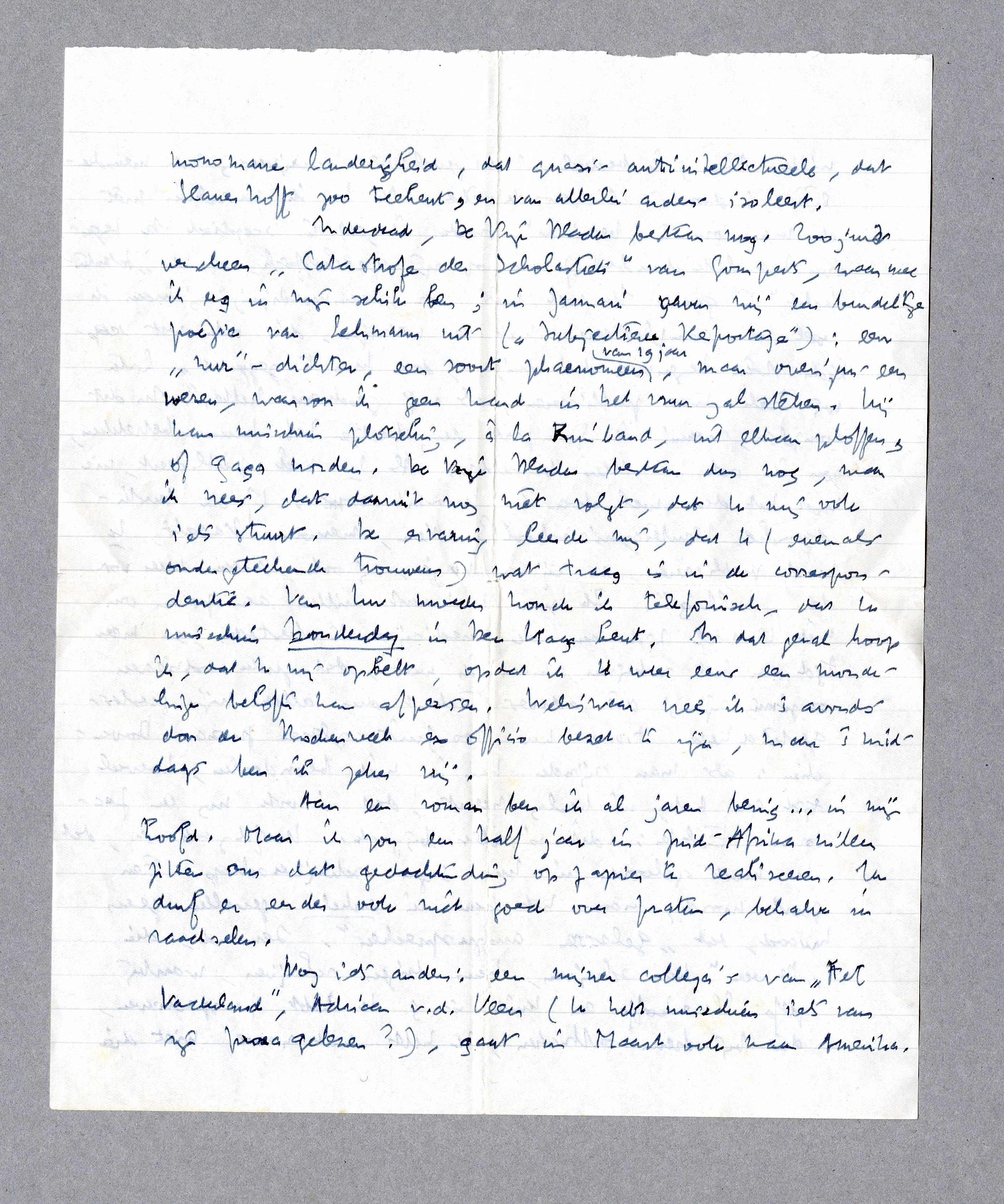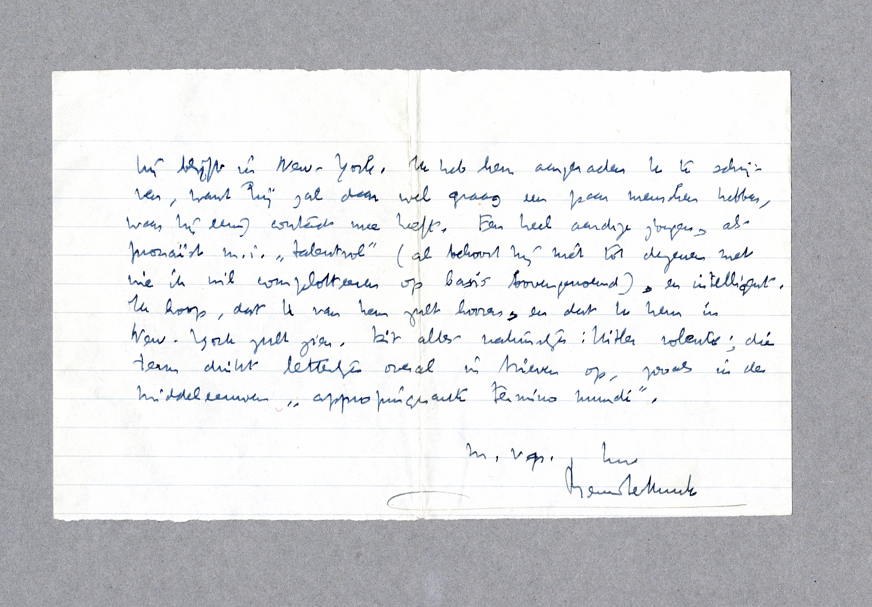 Nog iets anders: een mijner collega’s van ‘Het Vaderland’, Adriaan v.d. Veen ( U hebt misschien iets van zijn proza gelezen?), gaat in Maart ook naar Amerika, hij blijft in New-York. Ik heb hem aangeraden U te schrijven, want hij zal daar wel graag een paar menschen hebben, waar hij eenig contact mee heeft. Een heel aardige jongen, als prozaist m.i. ‘talentvol’ (al behoort hij niet tot degenen met wie ik wil complotteeren op basis bovengenoemd), en intelligent. Ik hoop, dat U van hem zult hooren, en dat U hem in New-York zult zien. Dit alles natuurlijk: Hitler volente; die term duikt letterlijk overal in brieven op, zooals in de middeleeuwen ‘appropinquante termino mundi’.