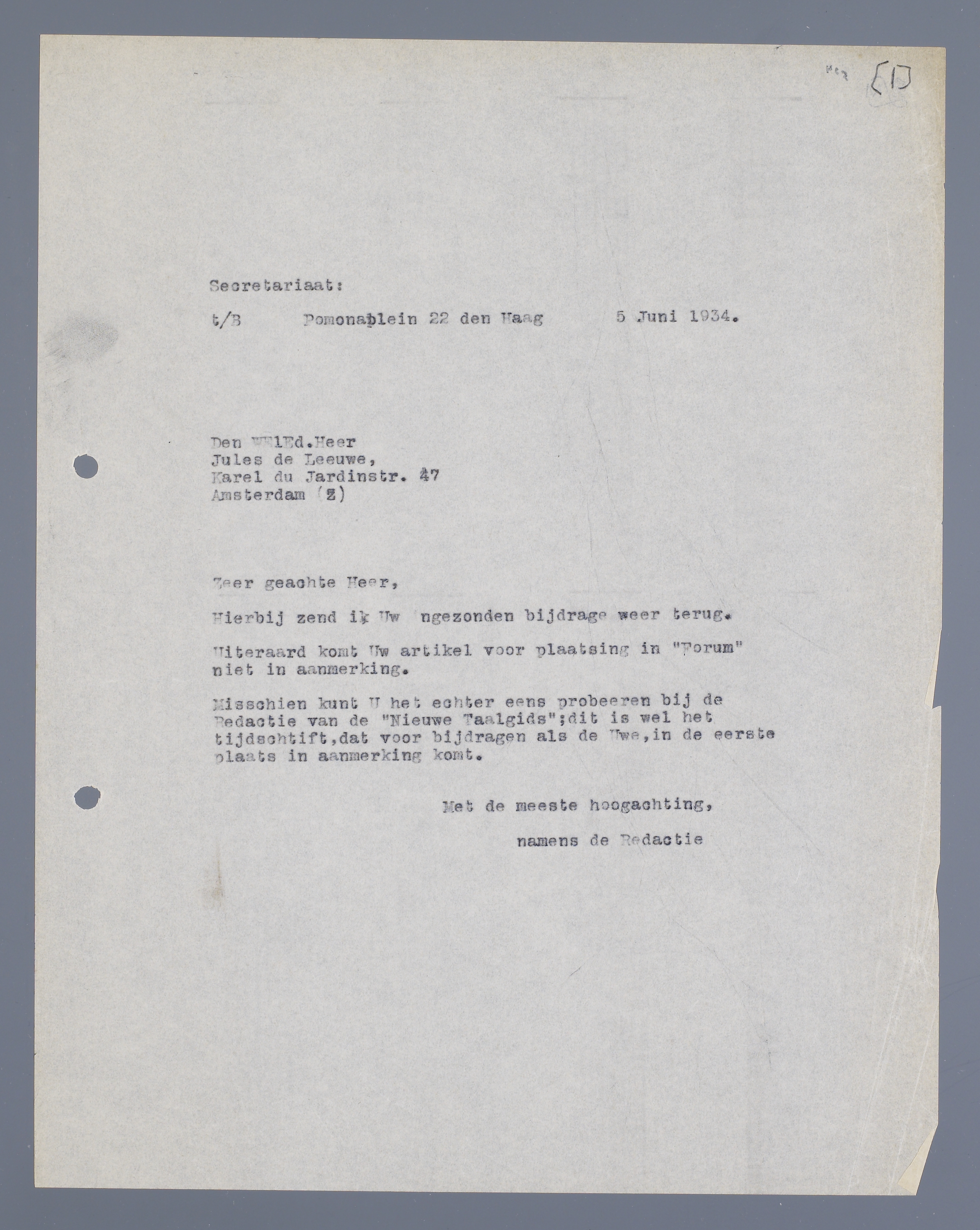 Misschien kunt u het echter eens probeeren bij de Redactie van de ‘Nieuwe Taalgids’, dit is wel het tijdschrift, dat voor bijdragen als de uwe, in de eerste plaats in aanmerking komt.