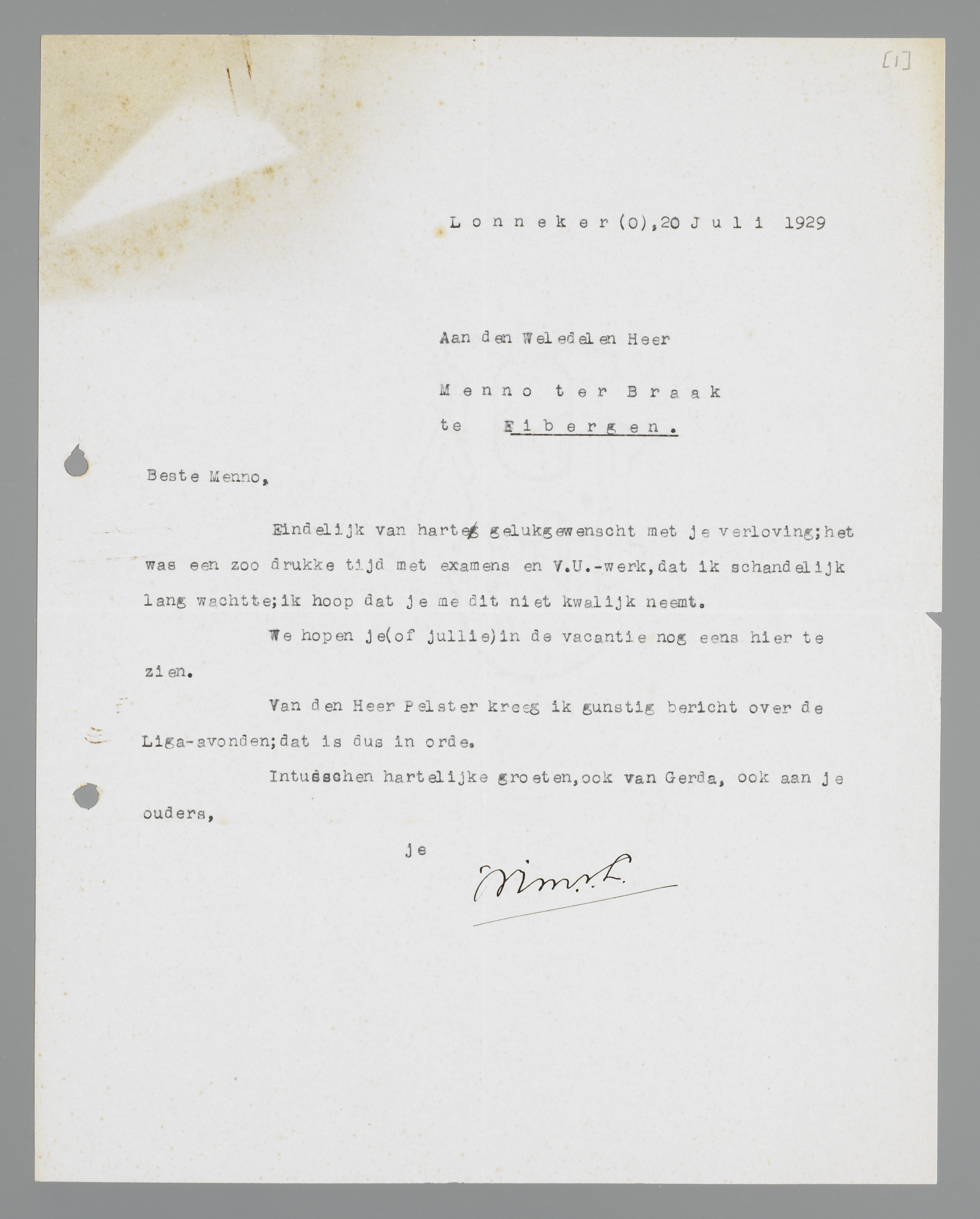 Eindelijk van harte gelukgewenscht met je verloving; het was een zoo drukke tijd met examens en V.U.-werk, dat ik schandelijk lang wachtte; ik hoop dat je me dit niet kwalijk neemt.