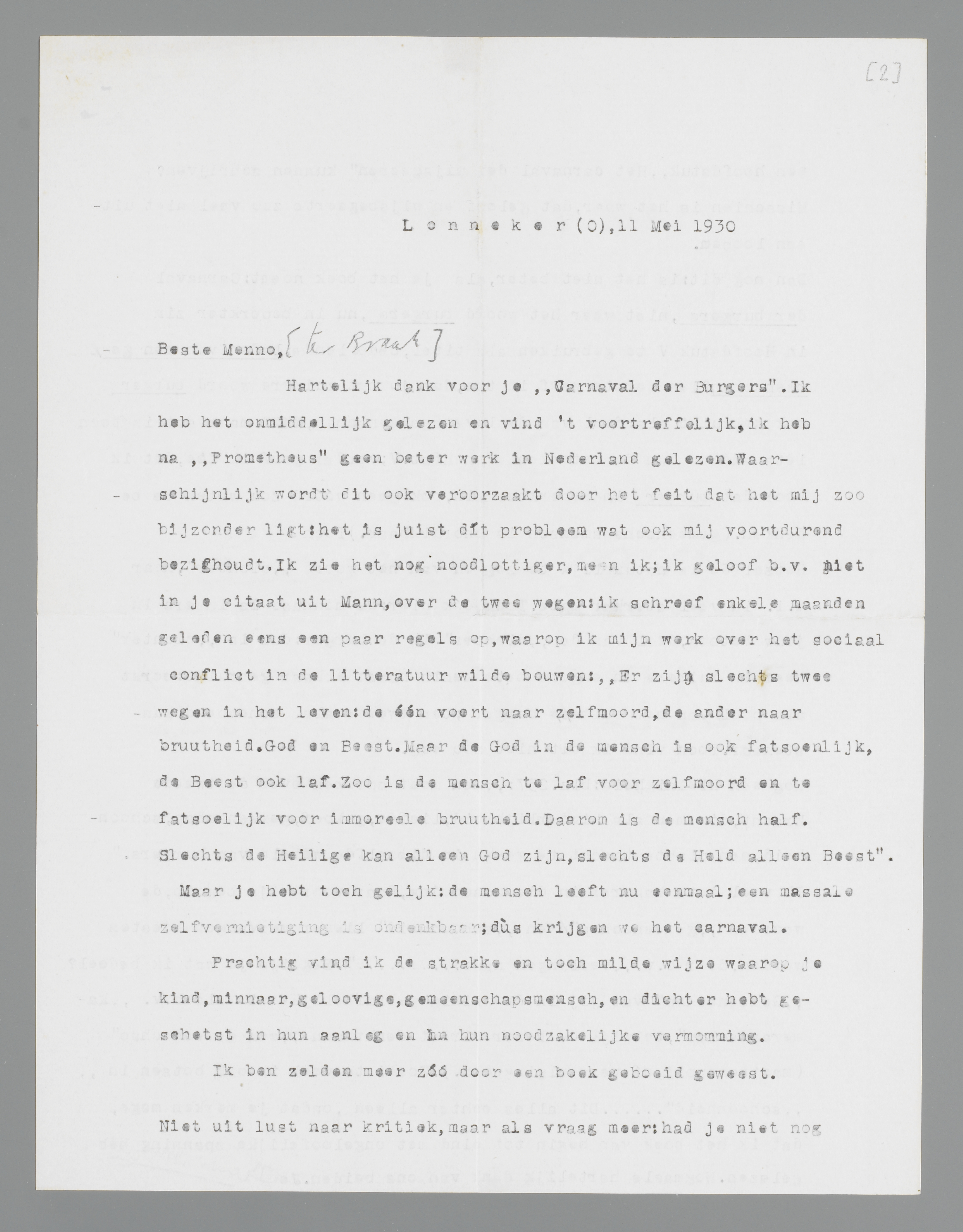Hartelijk dank voor je ‘Carnaval der Burgers’. Ik heb het onmiddellijk gelezen en vind 't voortreffelijk, ik heb na ‘Prometheus’ geen beter werk in Nederland gelezen. Waarschijnlijk wordt dit ook veroorzaakt door het feit dat het mij zoo bijzonder ligt: het is juist dit probleem wat ook mij voortdurend bezighoudt. Ik zie het nog noodlottiger, meen ik; ik geloof b.v. niet in je citaat uit Mann, over de twee wegen: ik schreef enkele maanden geleden eens een paar regels op, waarop ik mijn werk over het sociaal conflict in de litteratuur wilde bouwen: ‘Er zijn slechts twee wegen in het leven: de één voert naar zelfmoord, de ander naar bruutheid. God en Beest. Maar de God in de mensch is ook fatsoenlijk, de Beest ook laf, Zoo is de mensch te laf voor zelfmoord en te fatsoenlijk voor immoreele bruutheid. Daarom is de mensch half. Slechts de Heilige kan alleen God zijn, slechts de Held alleen Beest’.