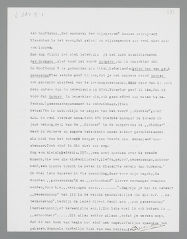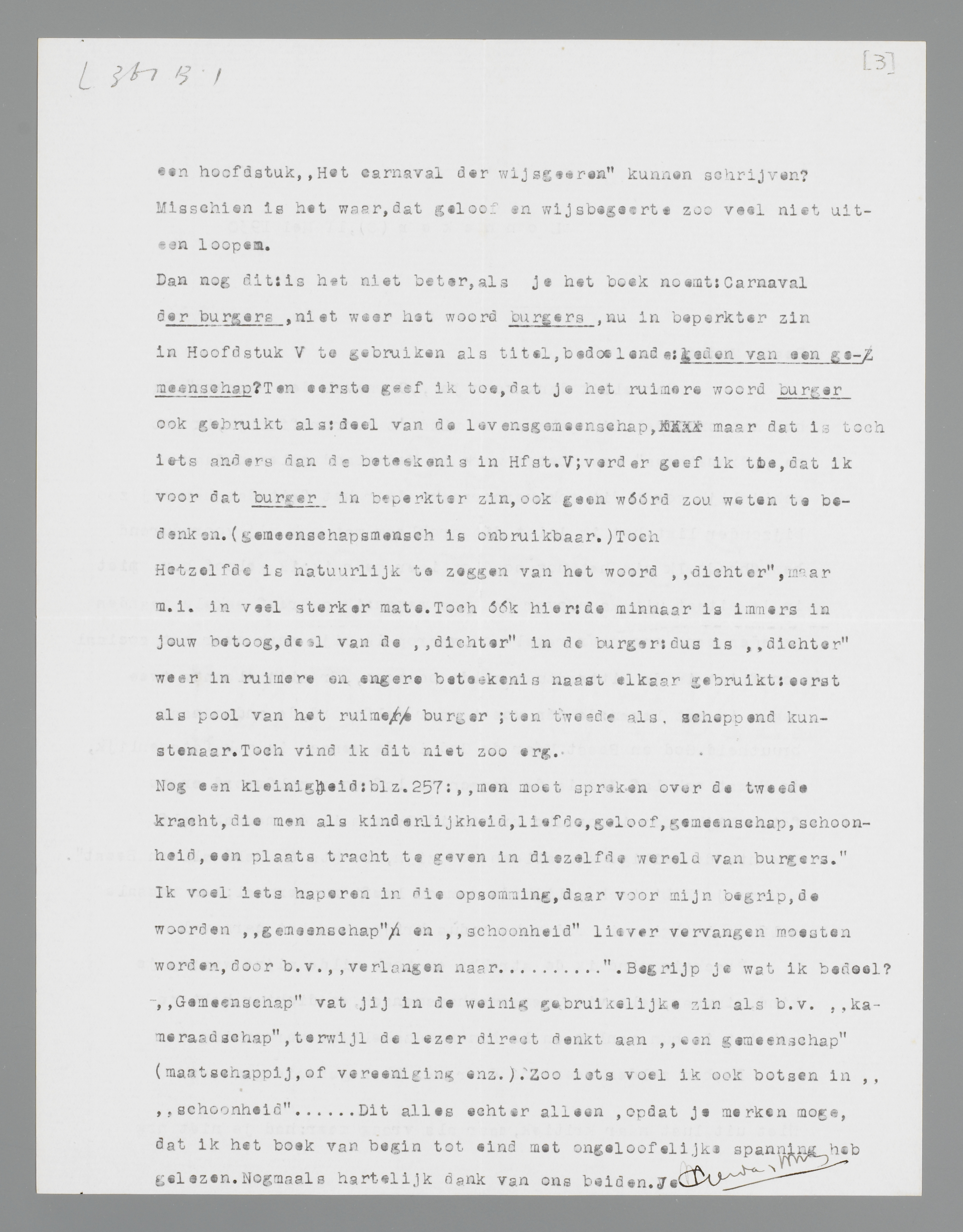 Nog een kleinigheid: blz. 257: ‘men moet spreken over de tweede kracht, die men als kinderlijkheid, liefde, geloof, gemeenschap, schoonheid, een plaats tracht te geven in diezelfde wereld van burgers.’ Ik voel iets haperen in die opsomming, daar voor mijn begrip, de woorden ‘gemeenschap’ en ‘schoonheid’ liever vervangen moesten worden, door b.v. ‘Verlangen naar...’. Begrijp je wat ik bedoel? ‘Gemeenschap’ vat jij in de weinig gebruikelijke zin als b.v. ‘Kameraadschap’, terwijl de lezer direct denkt aan ‘een gemeenschap’ (maatschappij, of vereeniging enz.). Zoo iets voel ik ook botsen in ‘schoonheid’... Dit alles echter alleen, opdat je merken moge, dat ik het boek van begin tot eind met ongeloofelijke spanning heb gelezen, Nogmaals hartelijk dank van ons beiden.