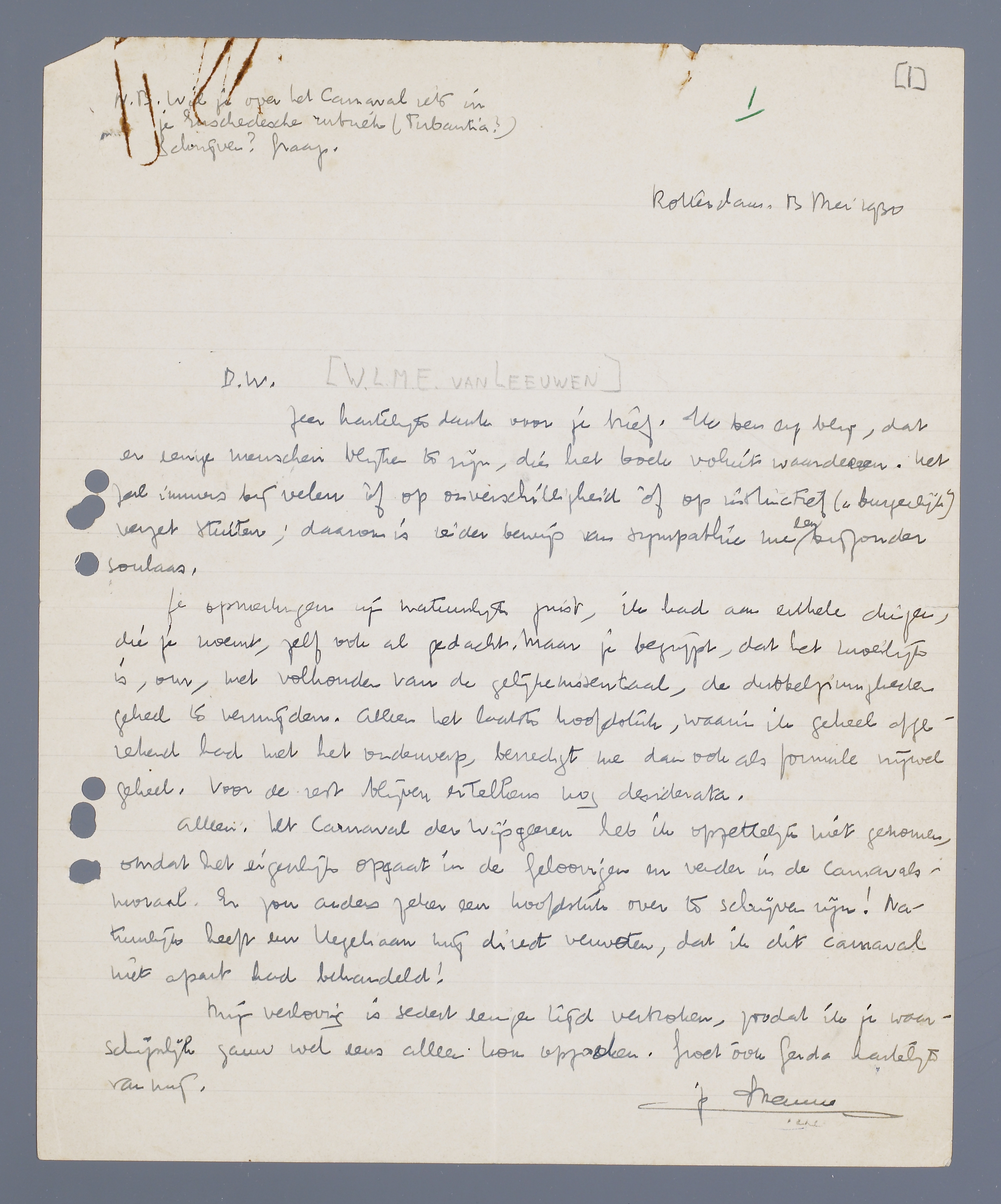 Zeer hartelijk dank voor je bref. Ik ben erg blij, dat er eenige menschen blijken te zijn, die het boek voluit waardeeren. Het zal immers bij velen óf op onverschilligheid óf op instinctief (‘burgerlijk’) verzet stuiten; daarom is ieder bewijs van sympahie me een bijzonder soulaas.