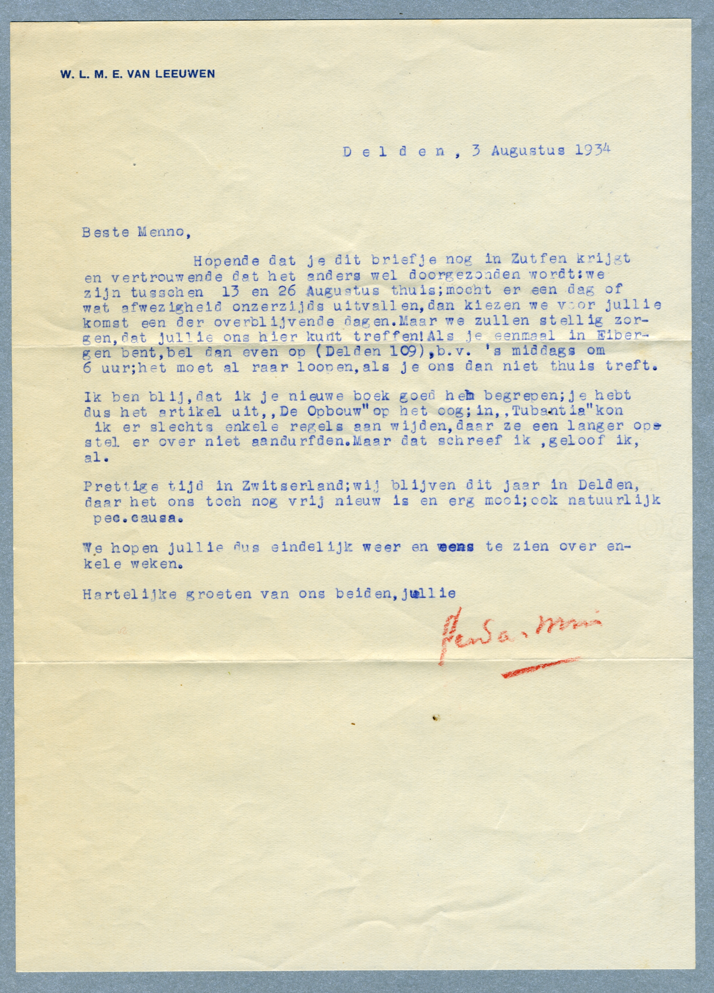 Hopende dat je dit briefje nog in Zutfen krijgt en vertrouwende dat het anders wel doorgezonden wordt: we zijn tusschen 13 en 26 Augustus thuis; mocht er een dag of wat afwezigheid onzerzijds uitvallen, dan kiezen we voor jullie komst een der overblijvende dagen. Maar we zullen stellig zorgen, dat jullie ons hier kunt treffen! Als je eenmaal in Eibergen bent, bel dan even op (Delden 109), b.v. 's middags om 6 uur; het moet al raar loopen, als je ons dan niet thuis treft.